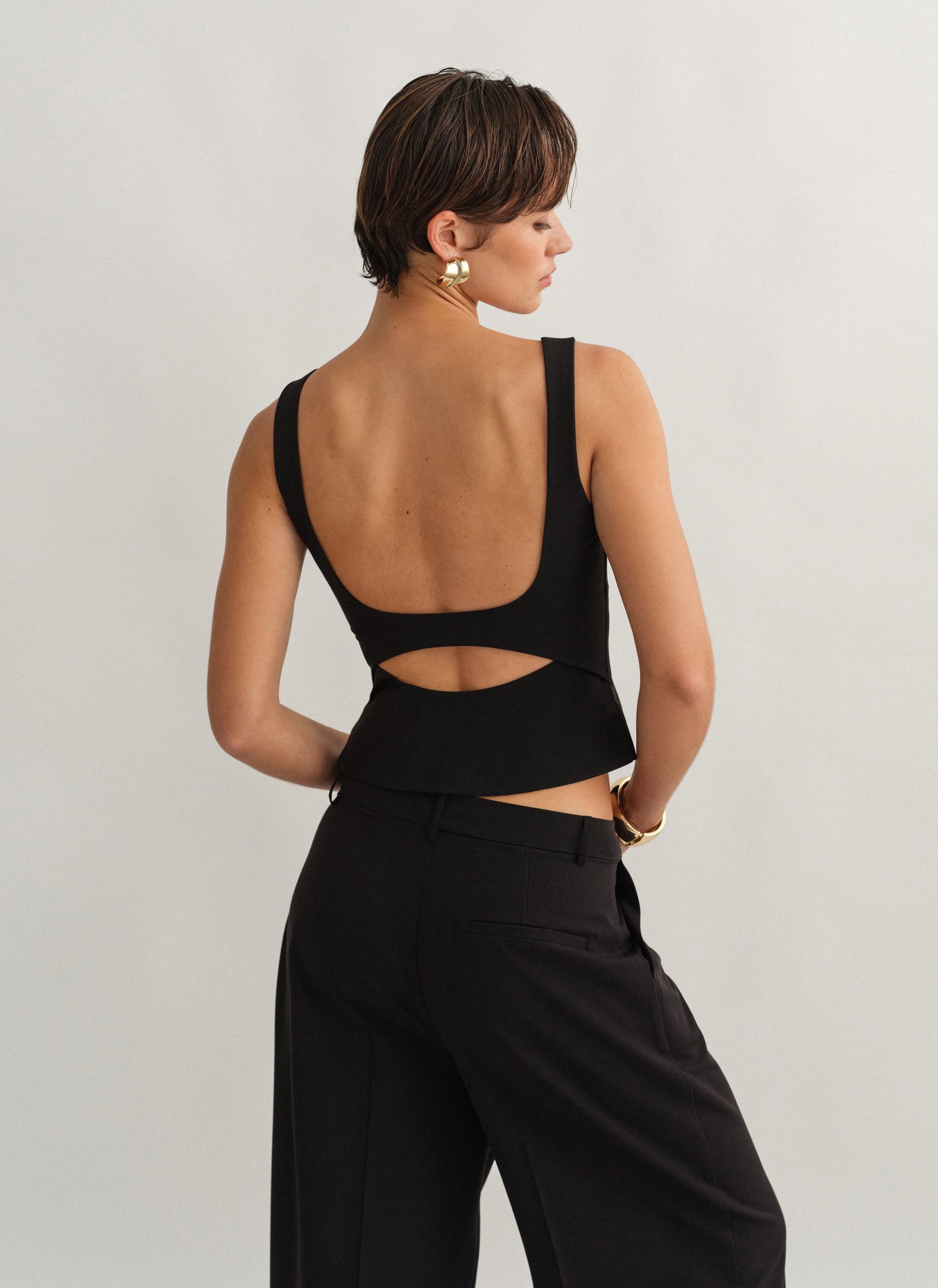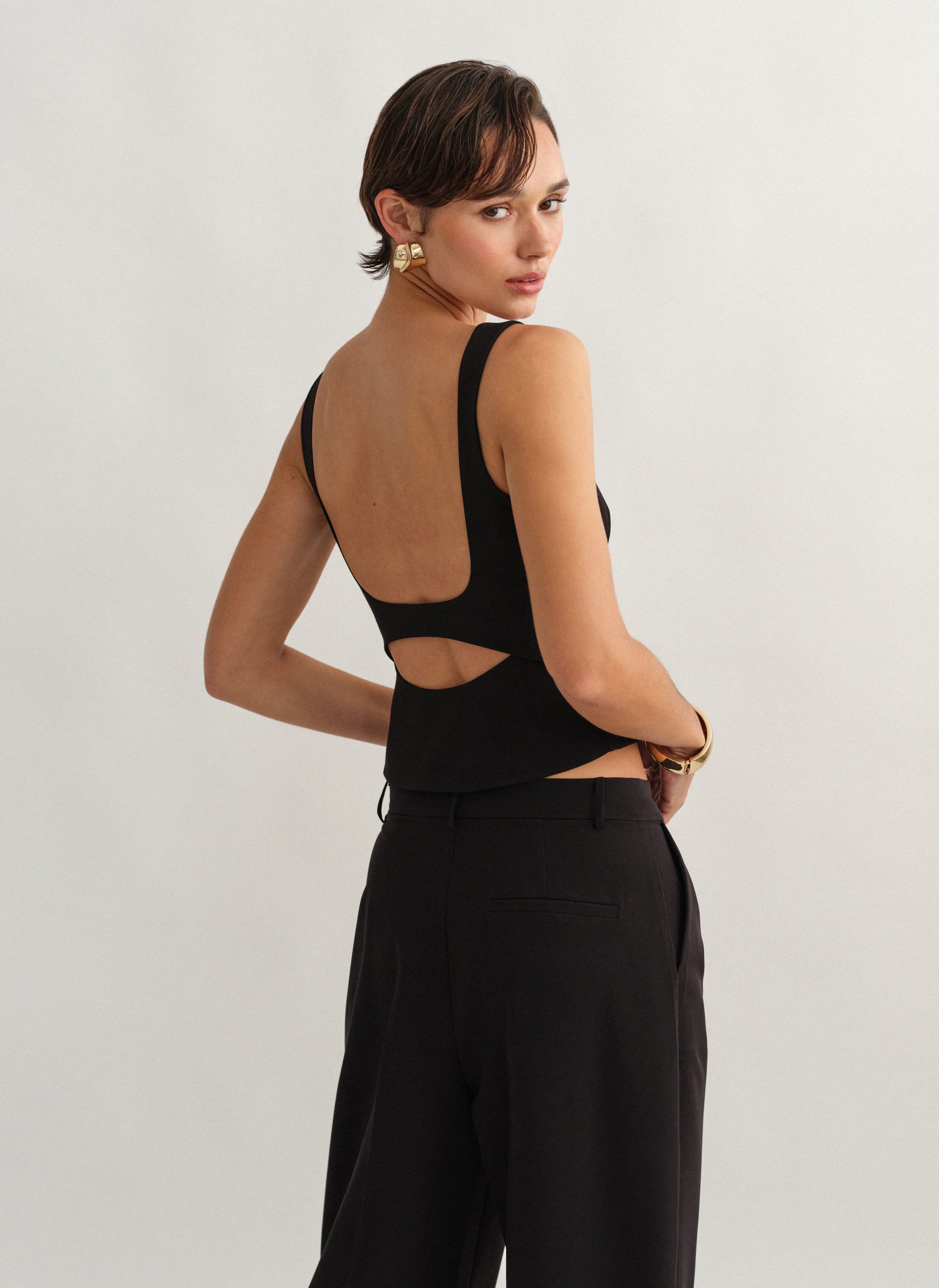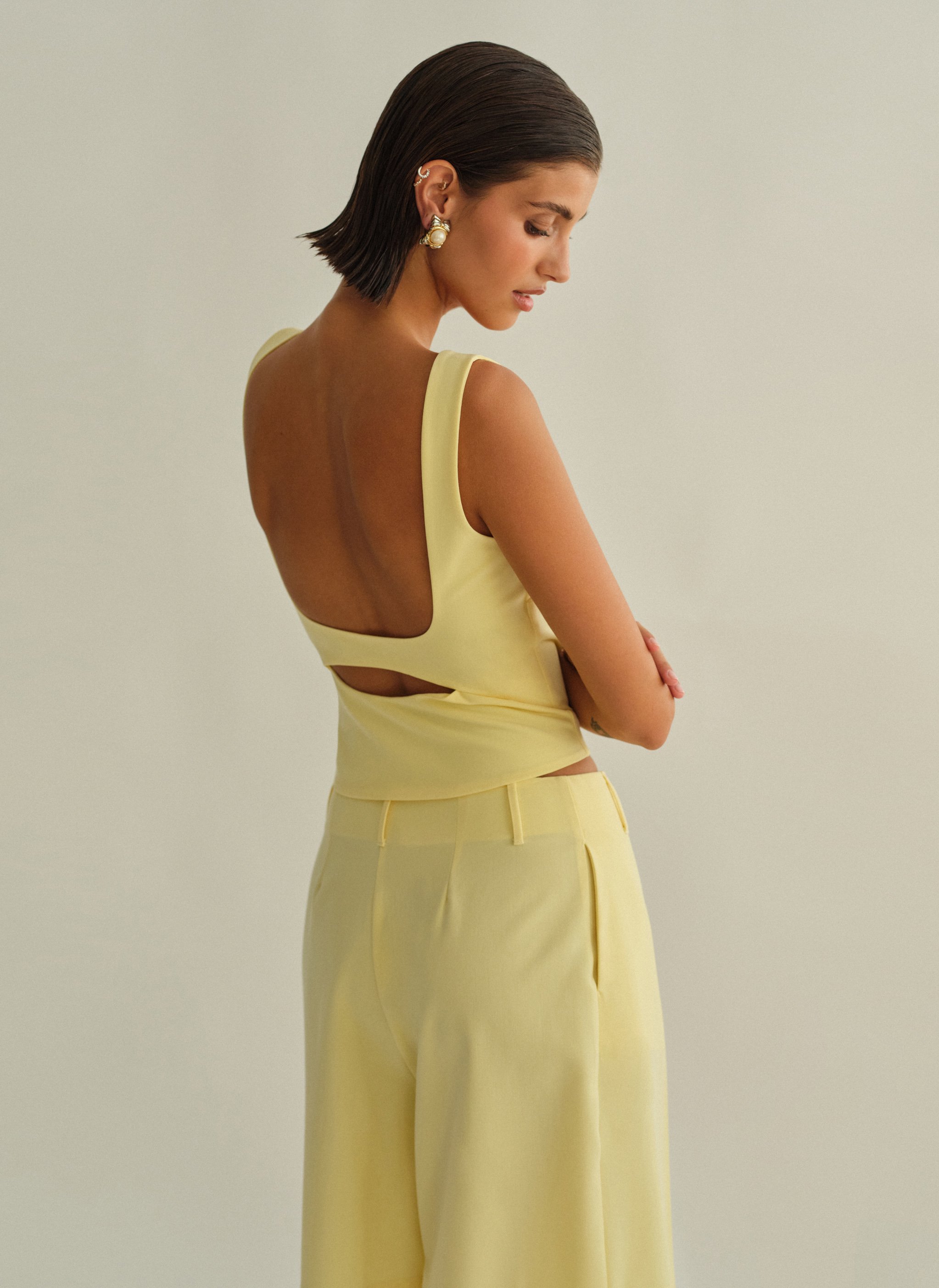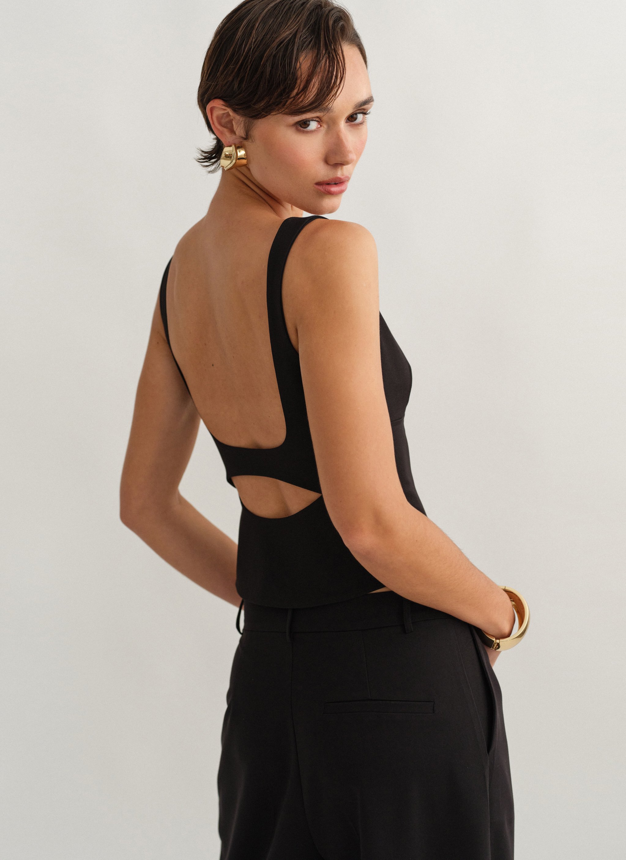 Τοπ με άνοιγμα στην πλάτη, φαρδιές τιράντες και κλείσιμο στο πλάι με κρυφό φερμουάρ.
