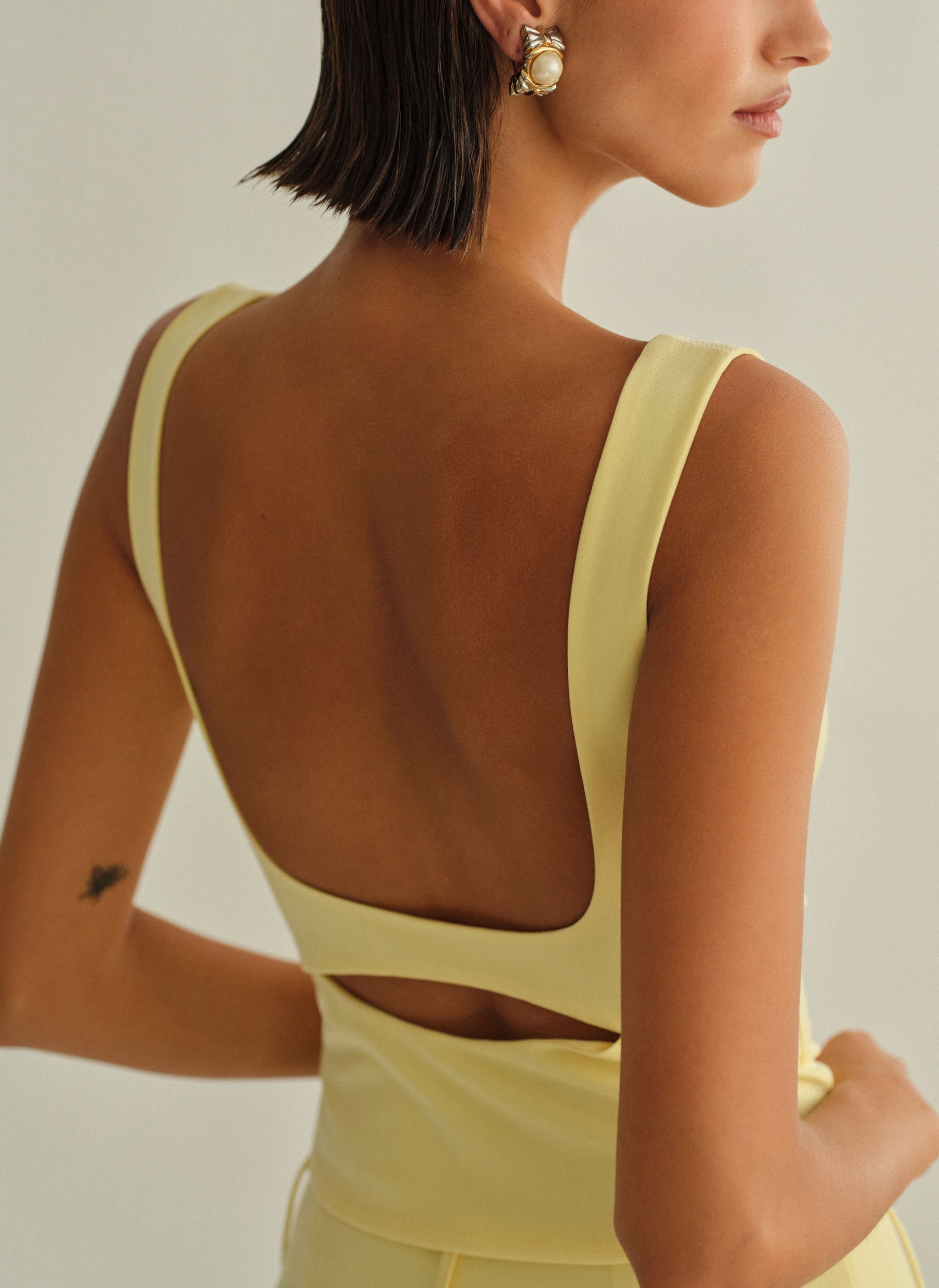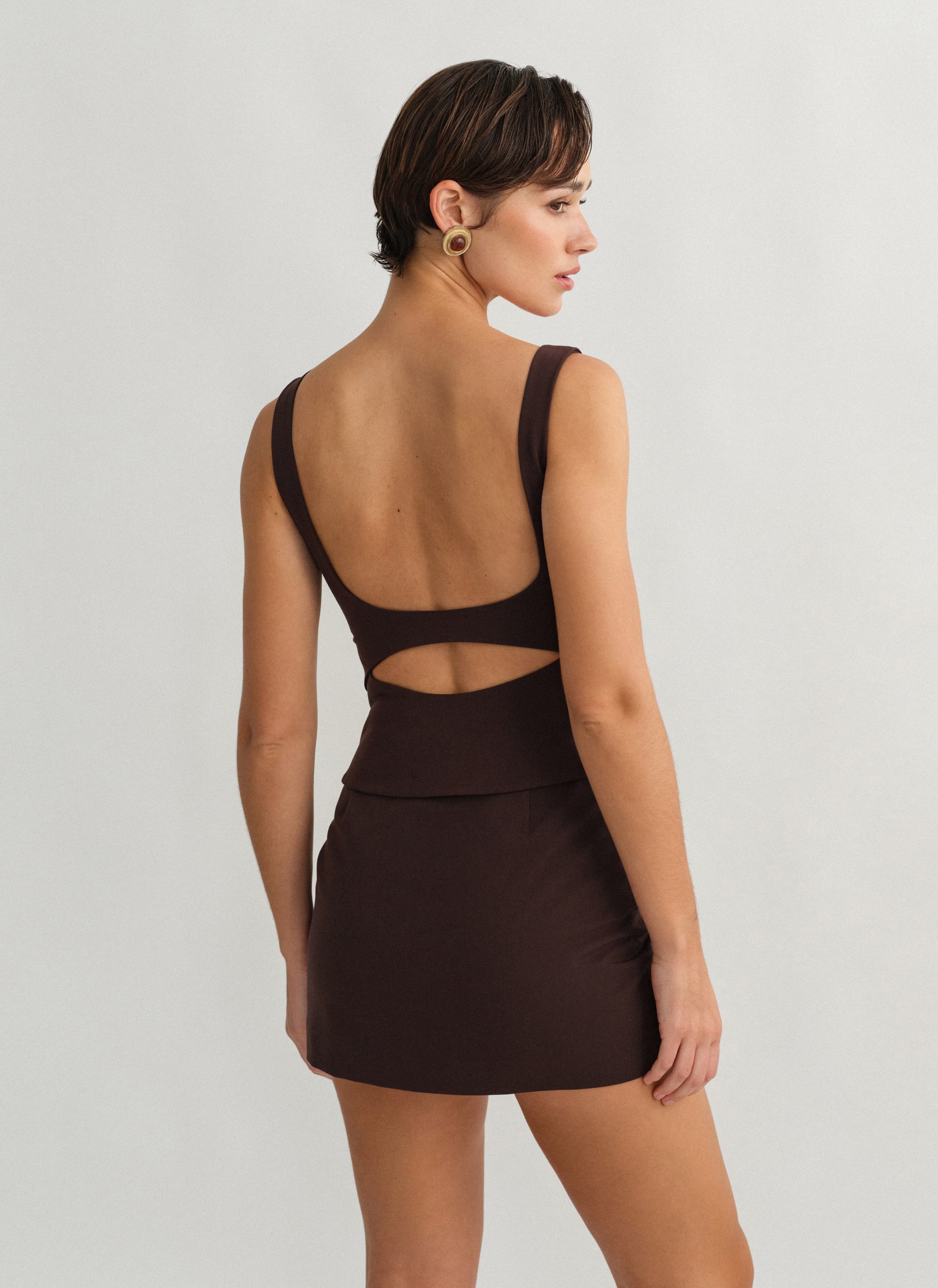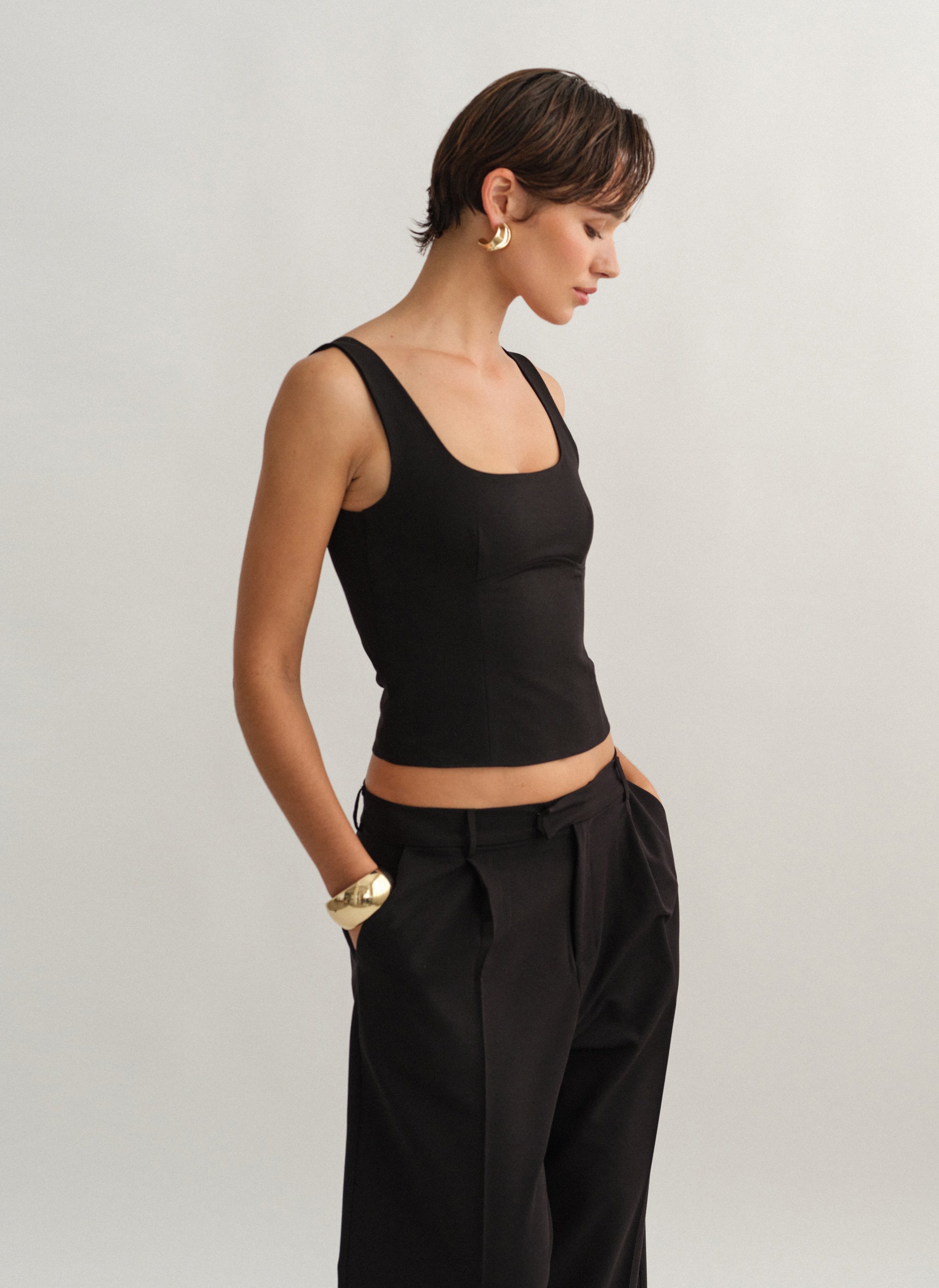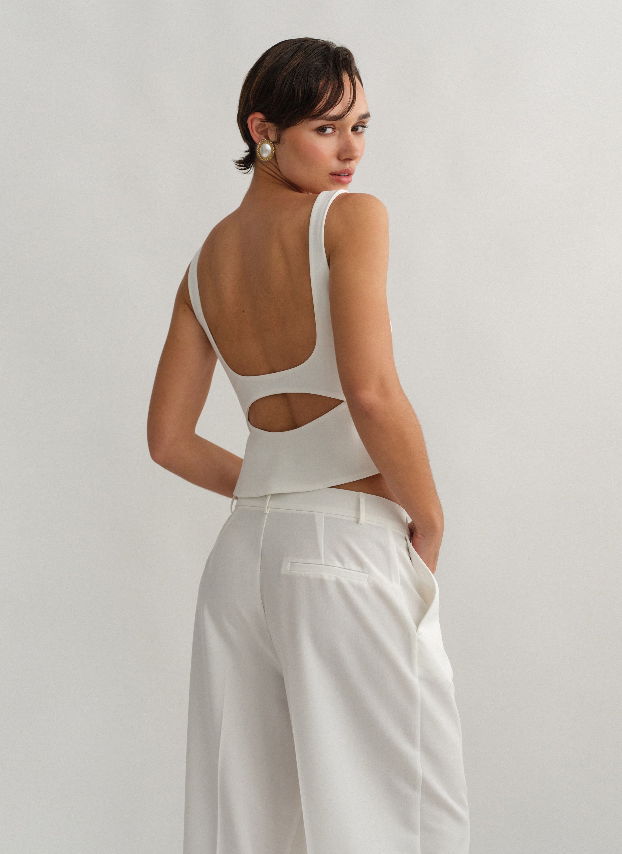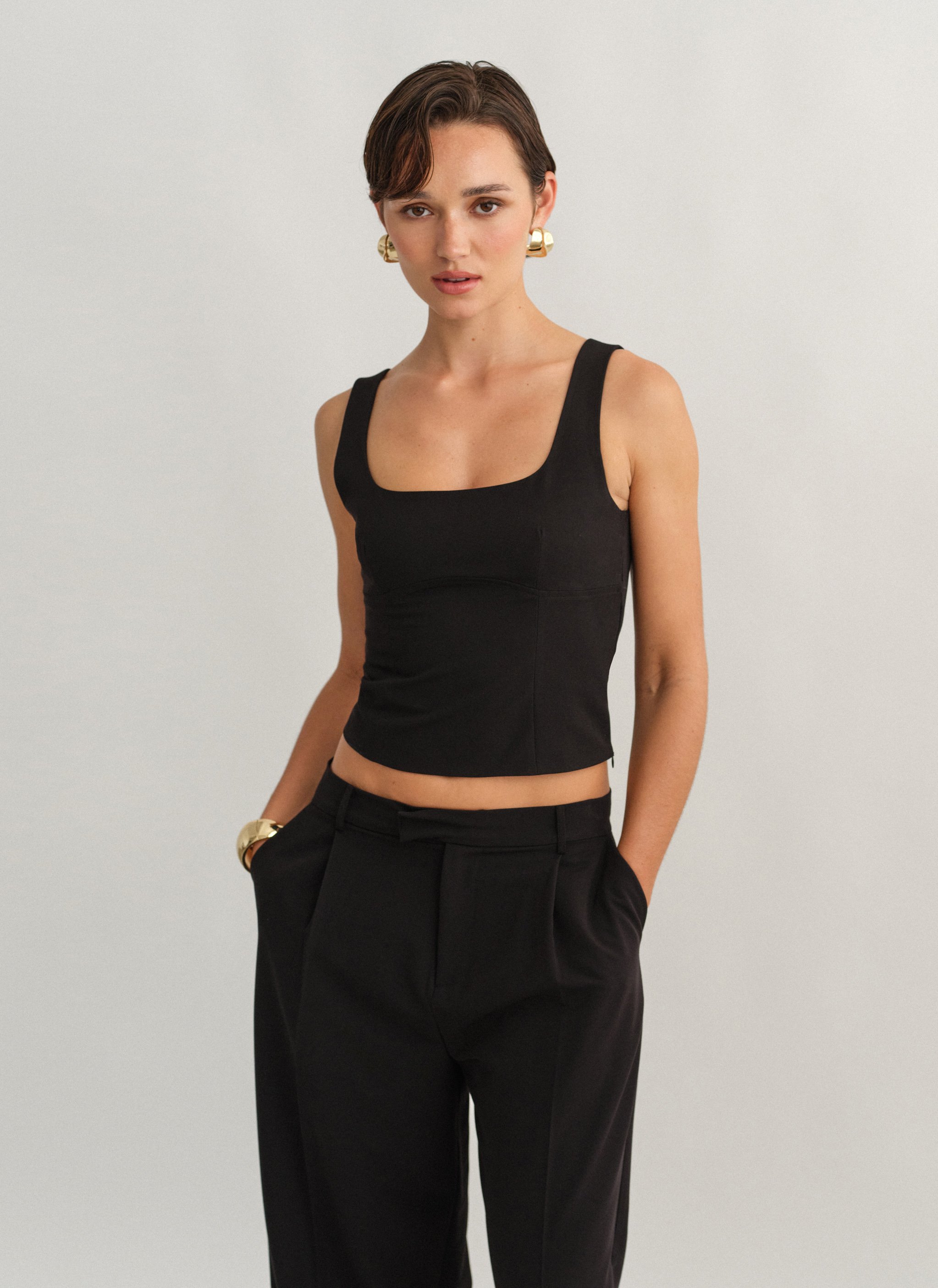 Τοπ με άνοιγμα στην πλάτη, φαρδιές τιράντες και κλείσιμο στο πλάι με κρυφό φερμουάρ.