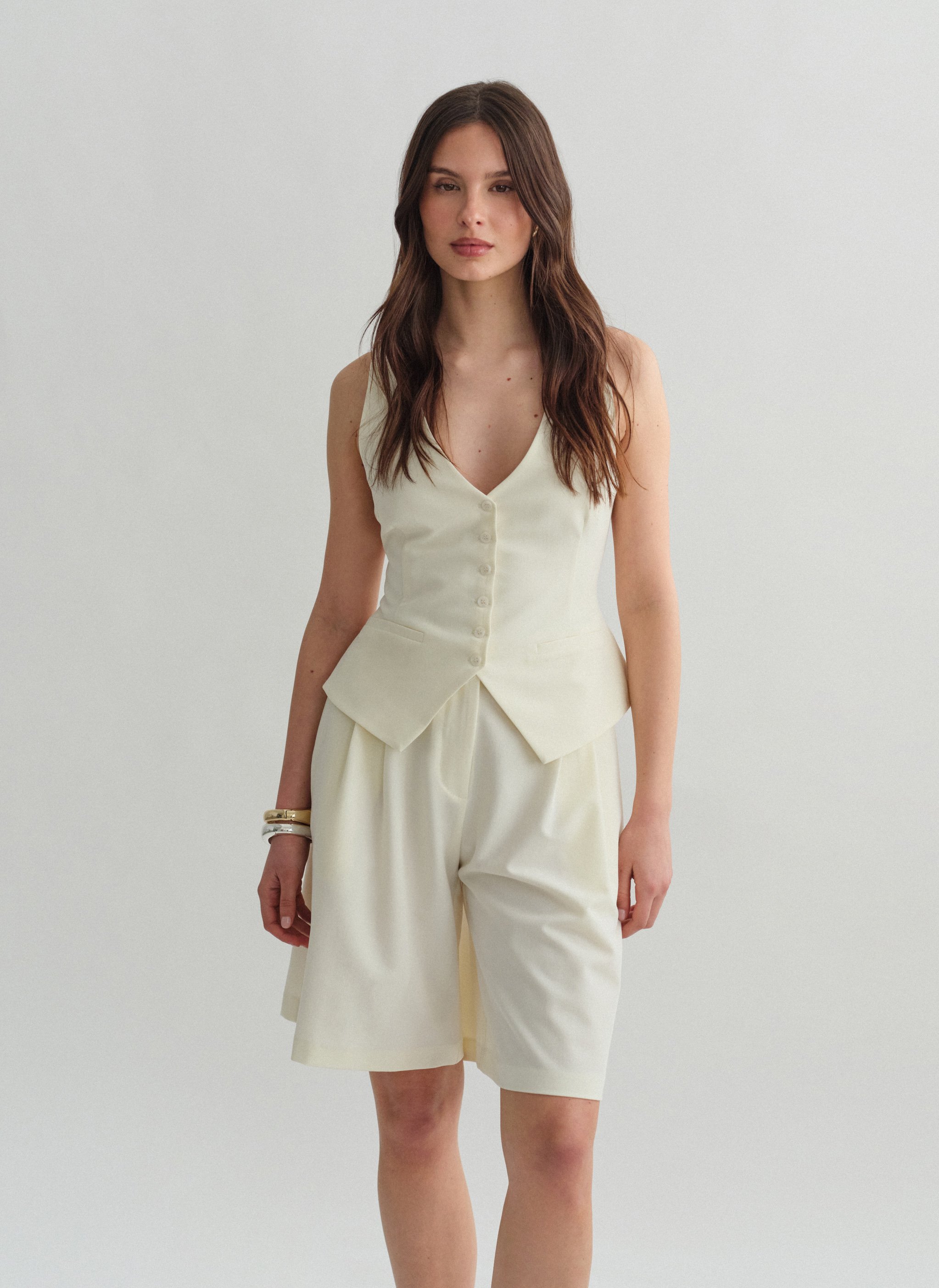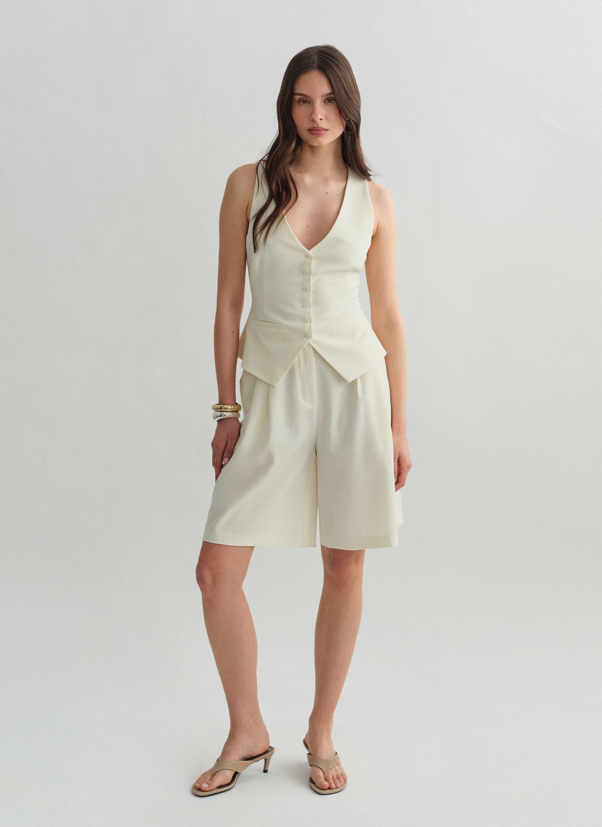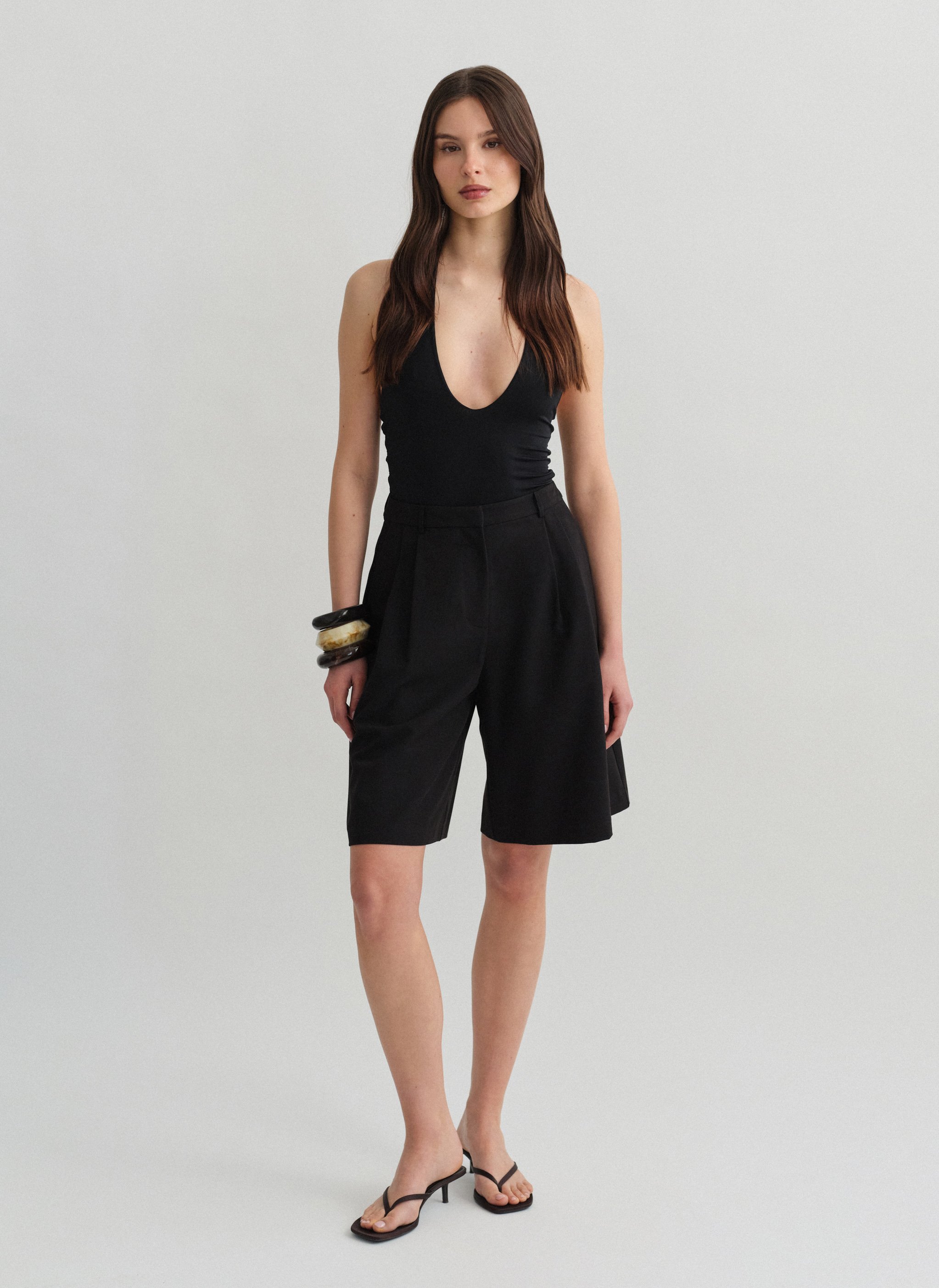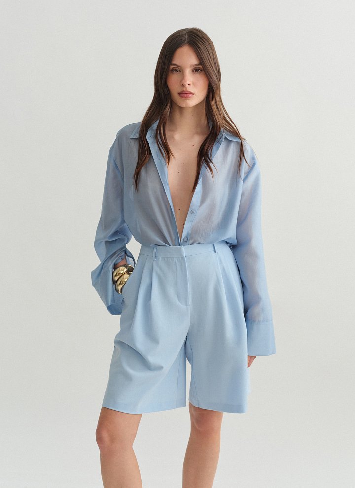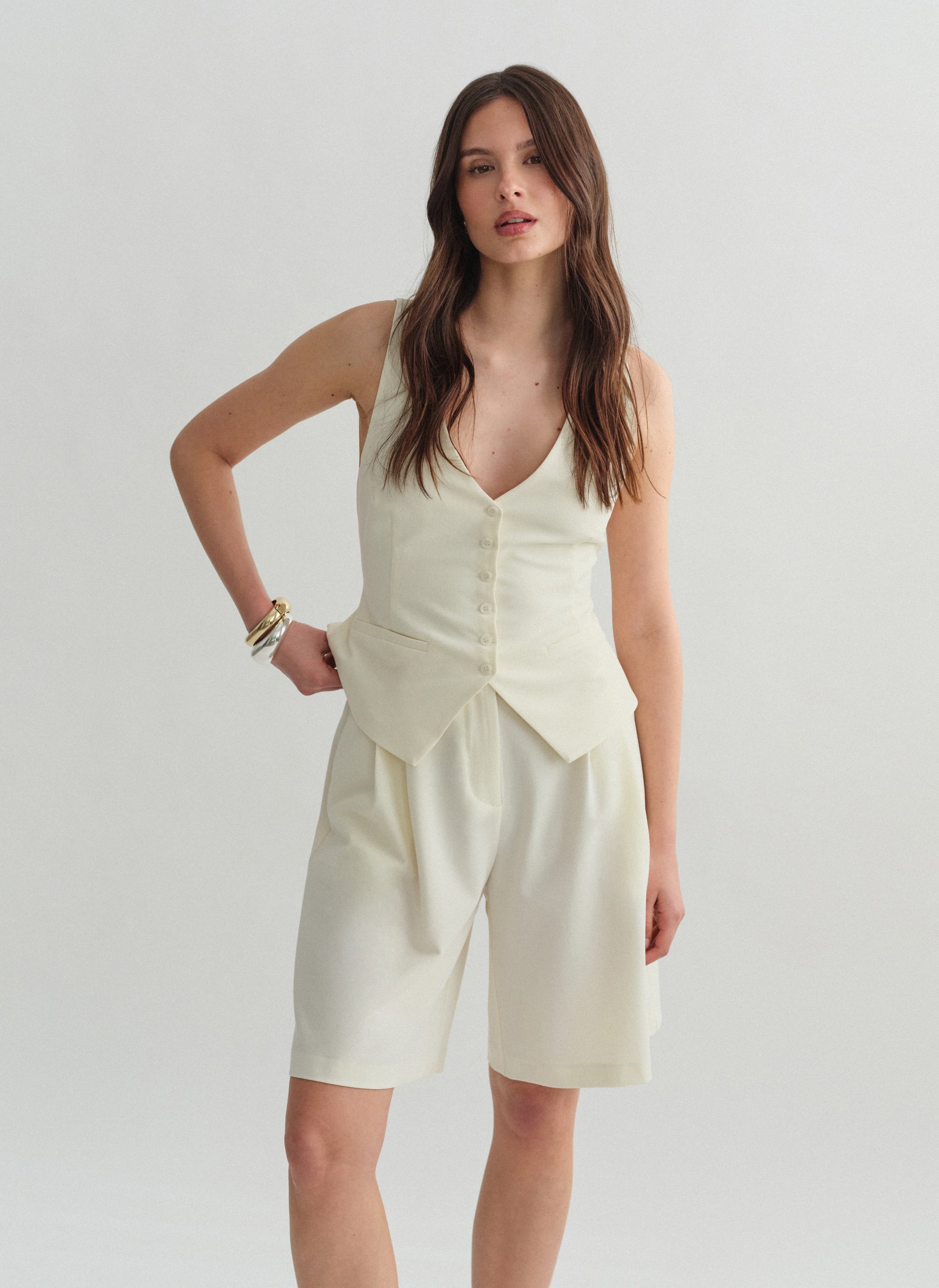 Ψηλόμεση μακριά υφασμάτινη βερμούδα με πιέτες και τσέπες.