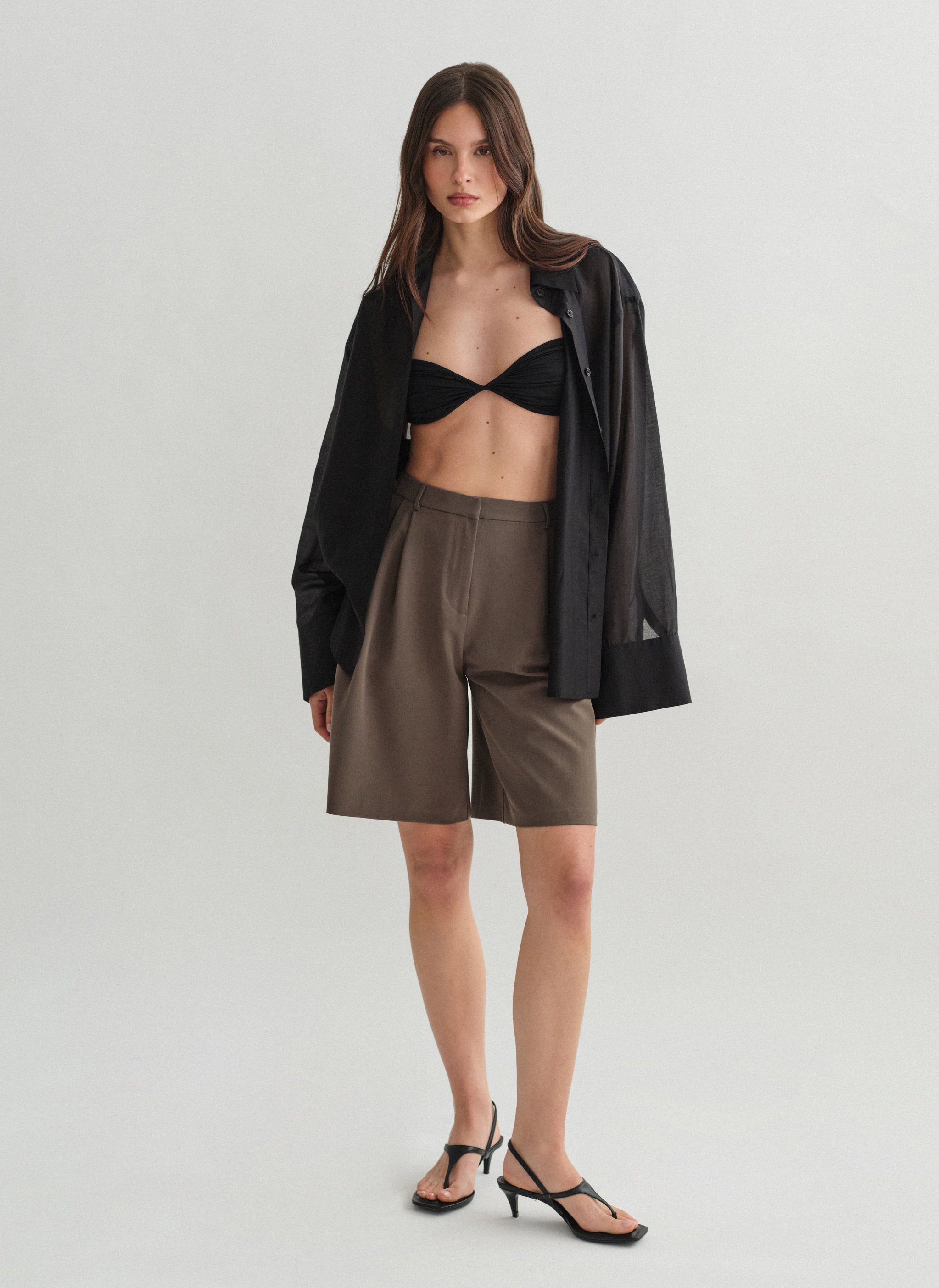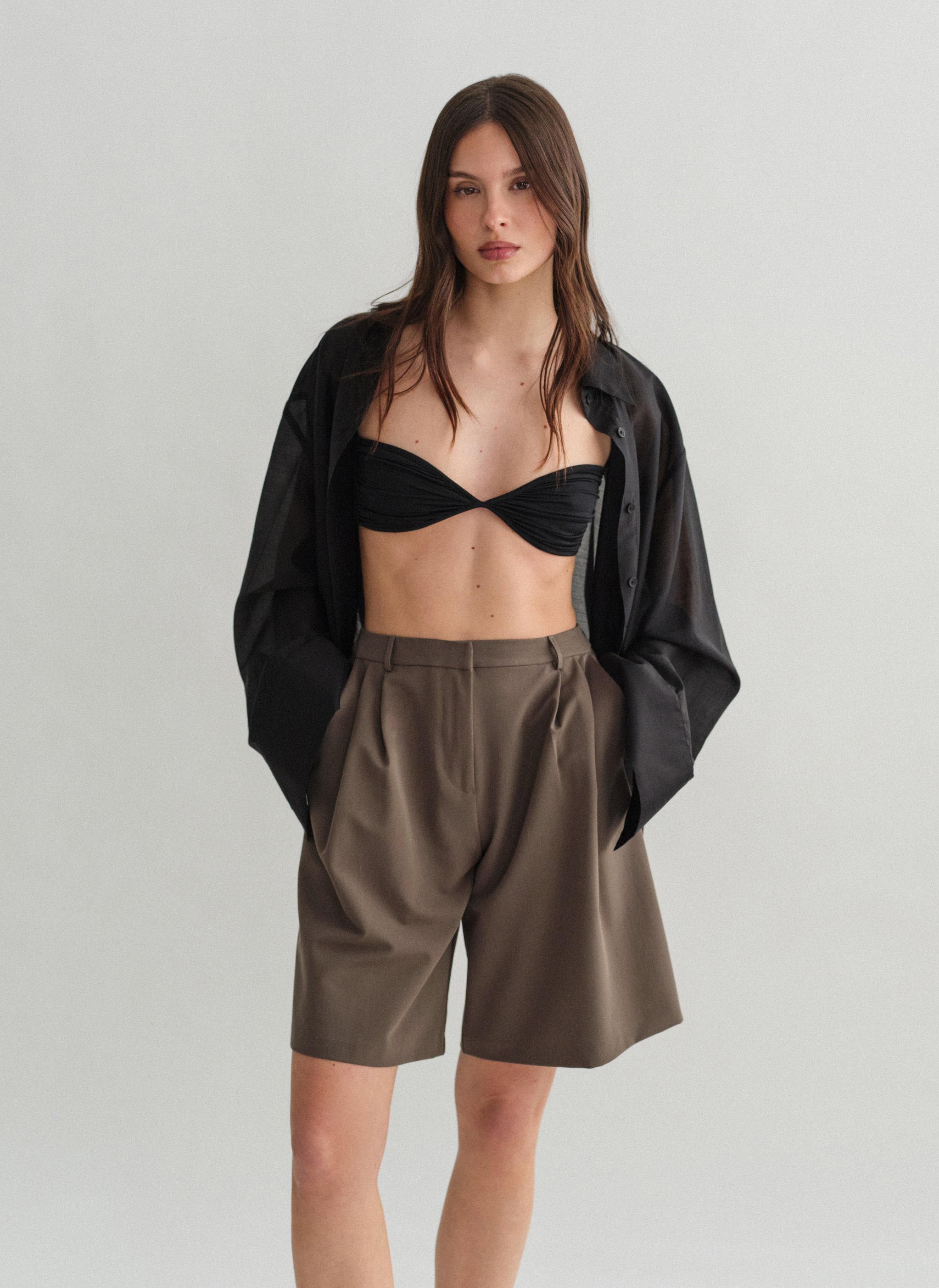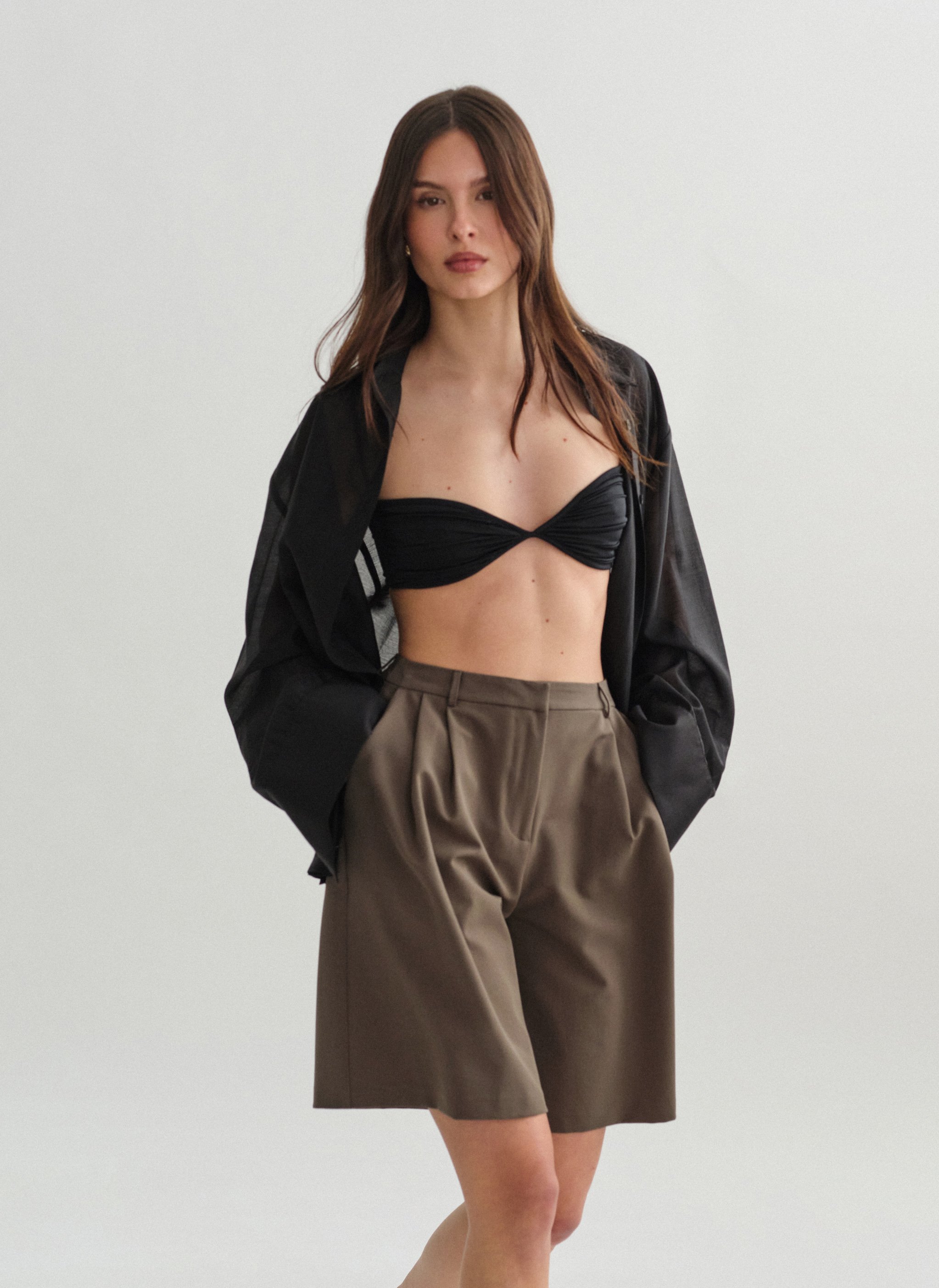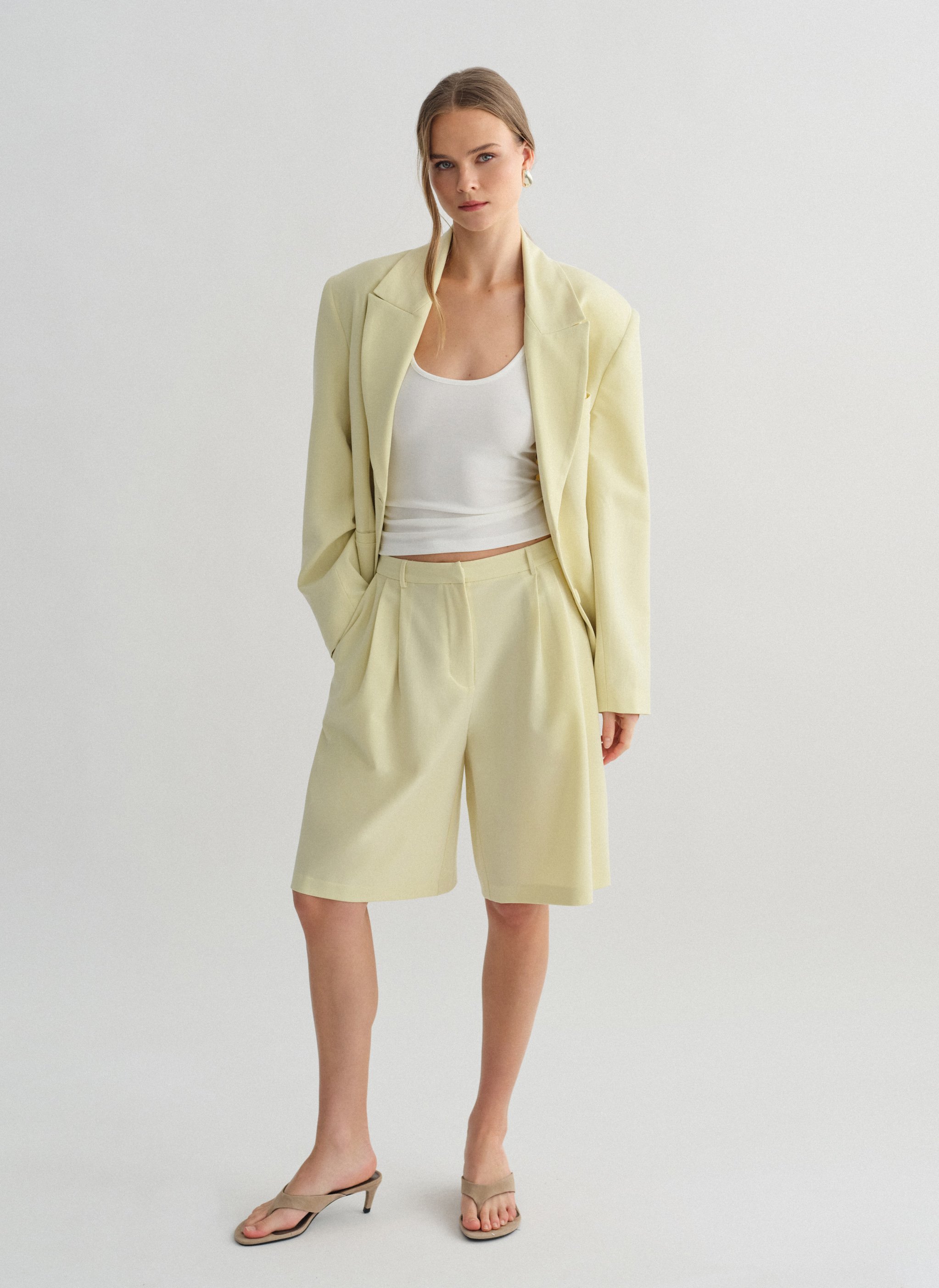 Ψηλόμεση μακριά υφασμάτινη βερμούδα με πιέτες και τσέπες.