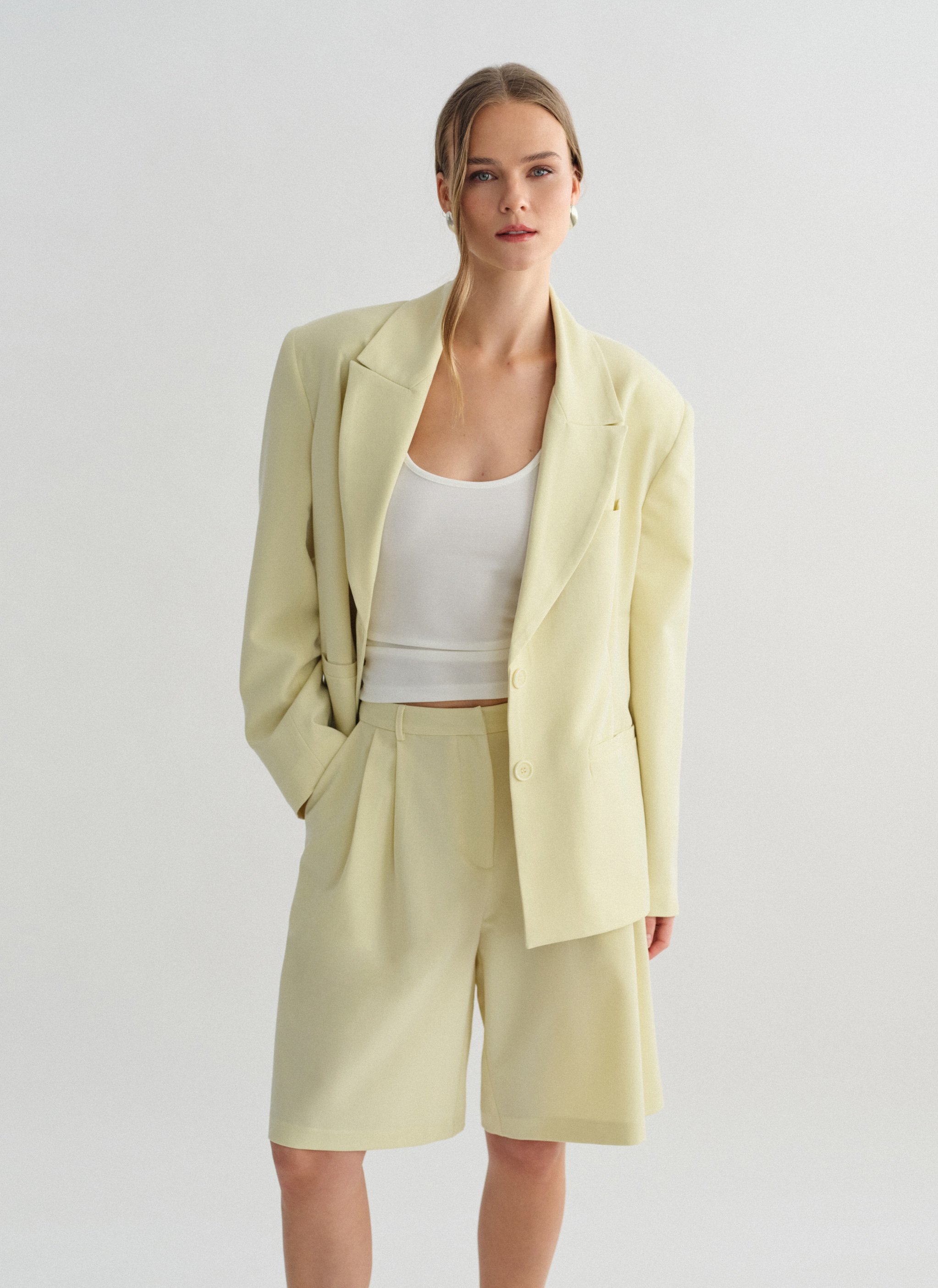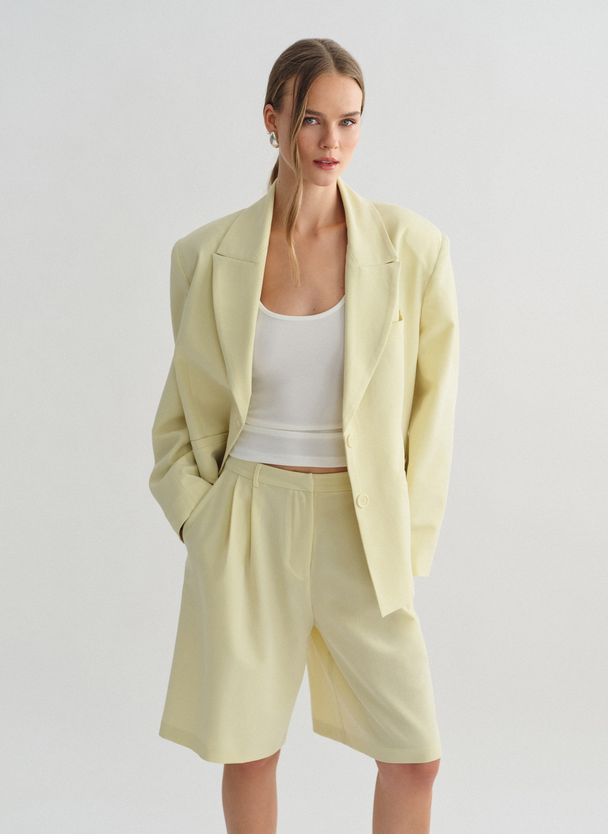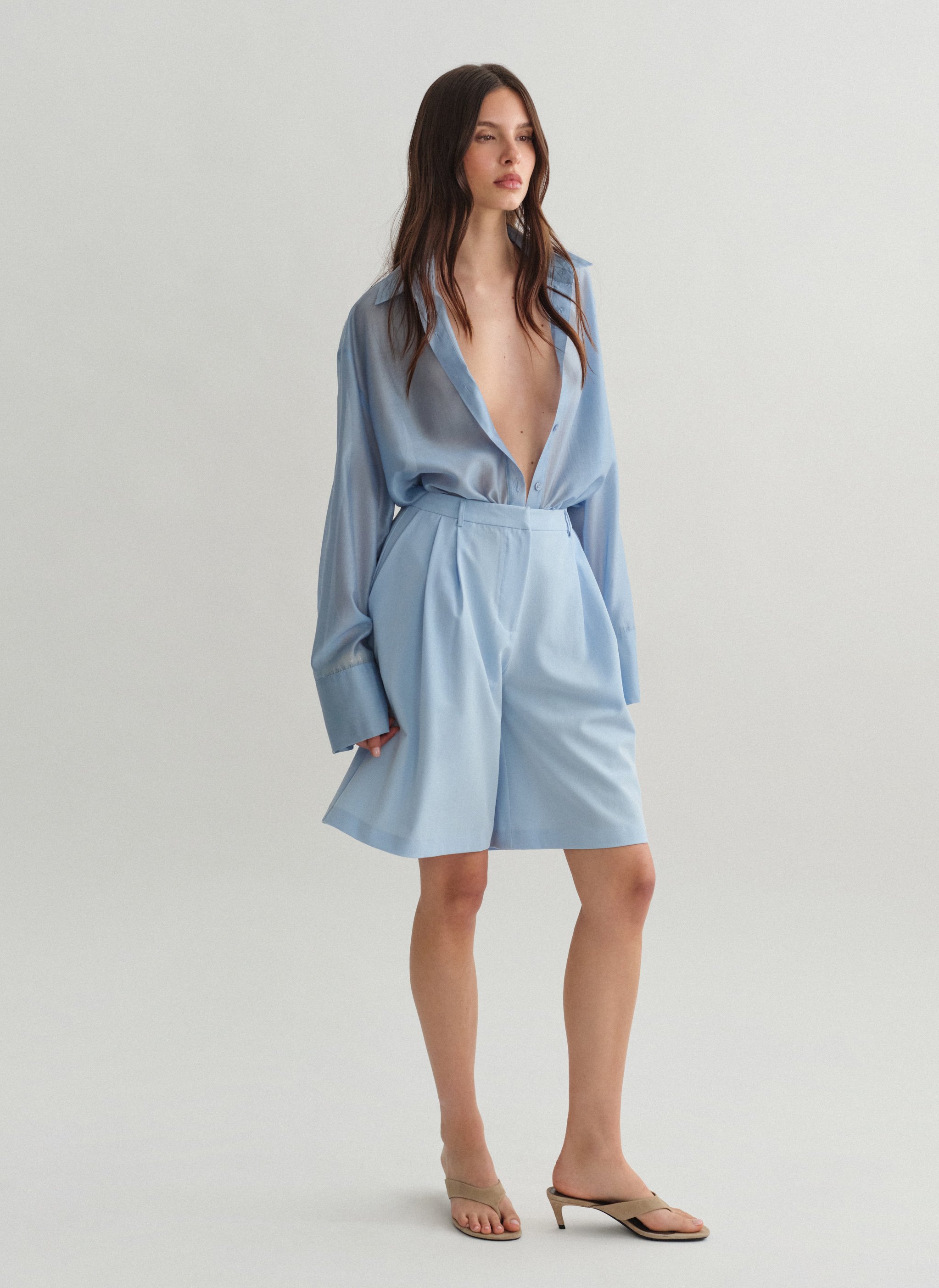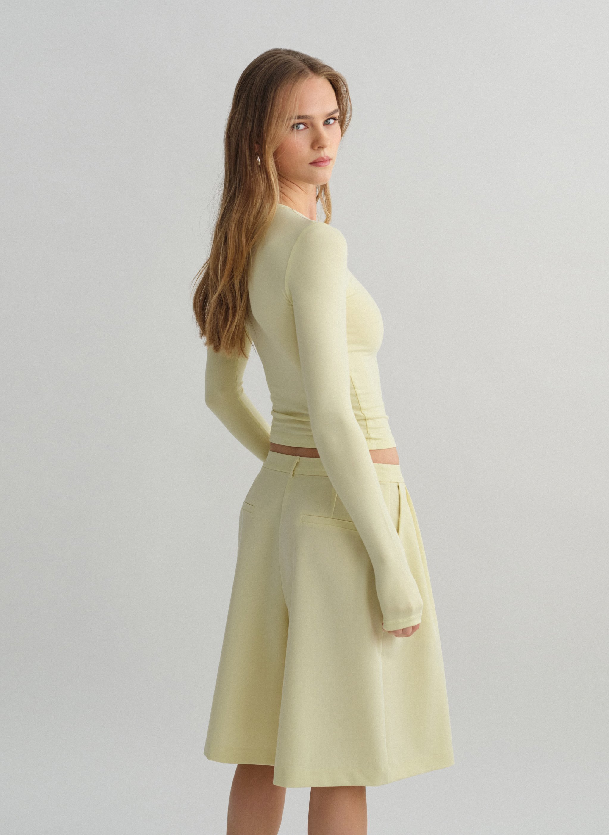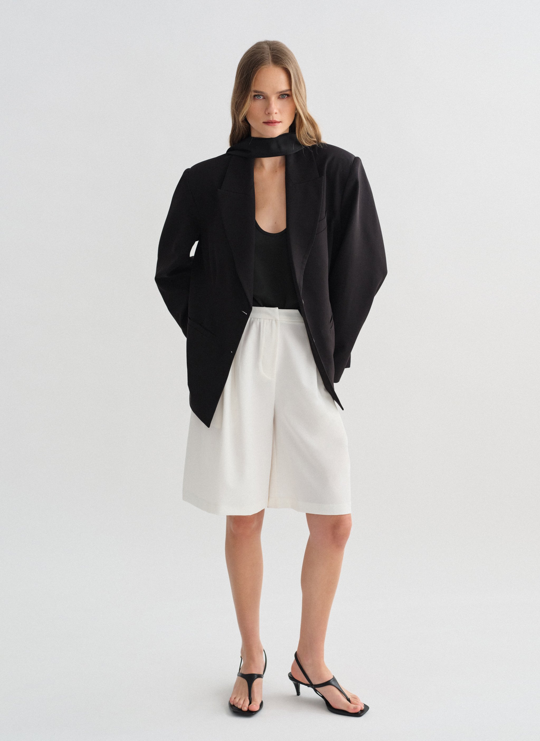 Ψηλόμεση μακριά υφασμάτινη βερμούδα με πιέτες και τσέπες.