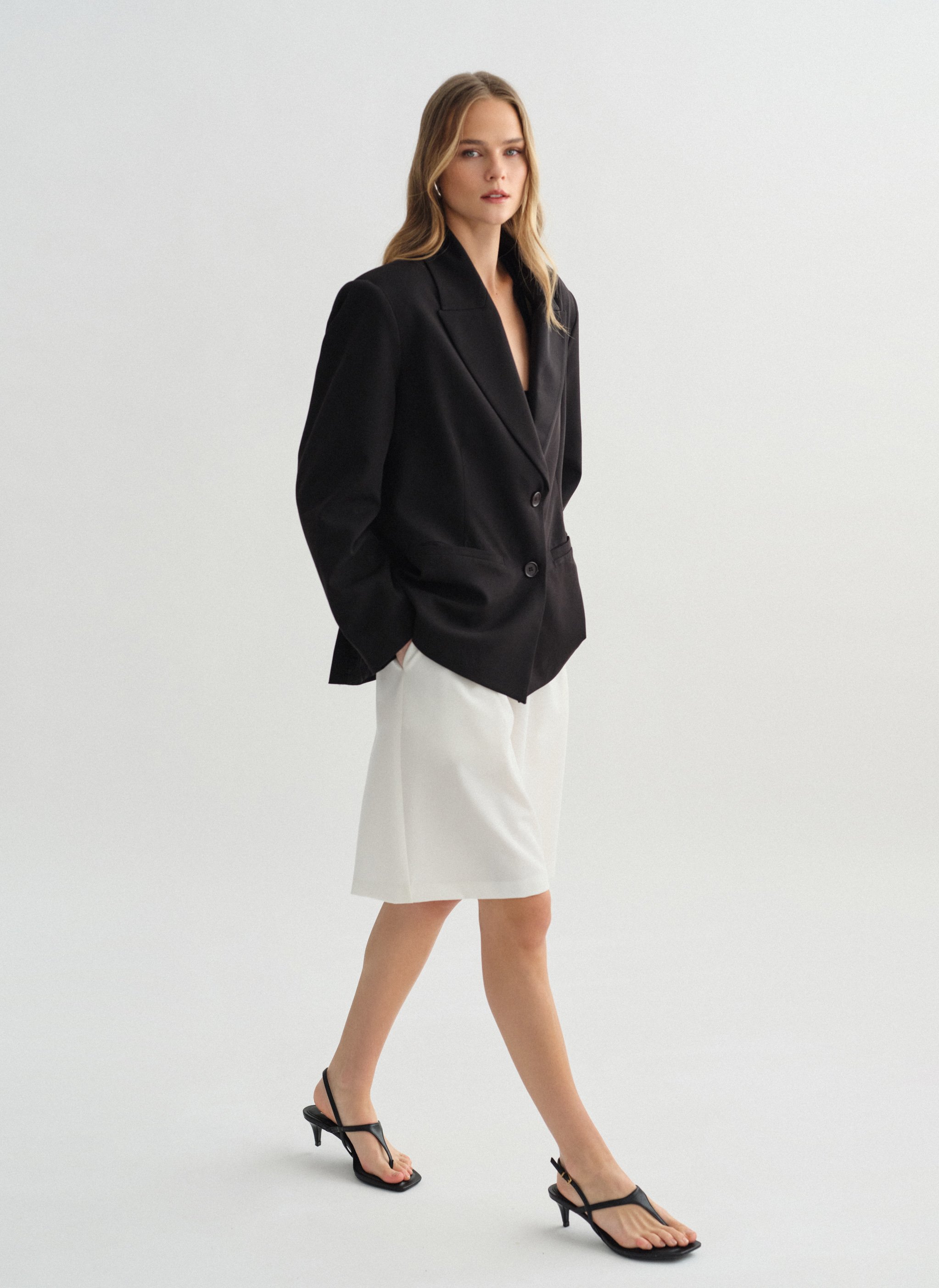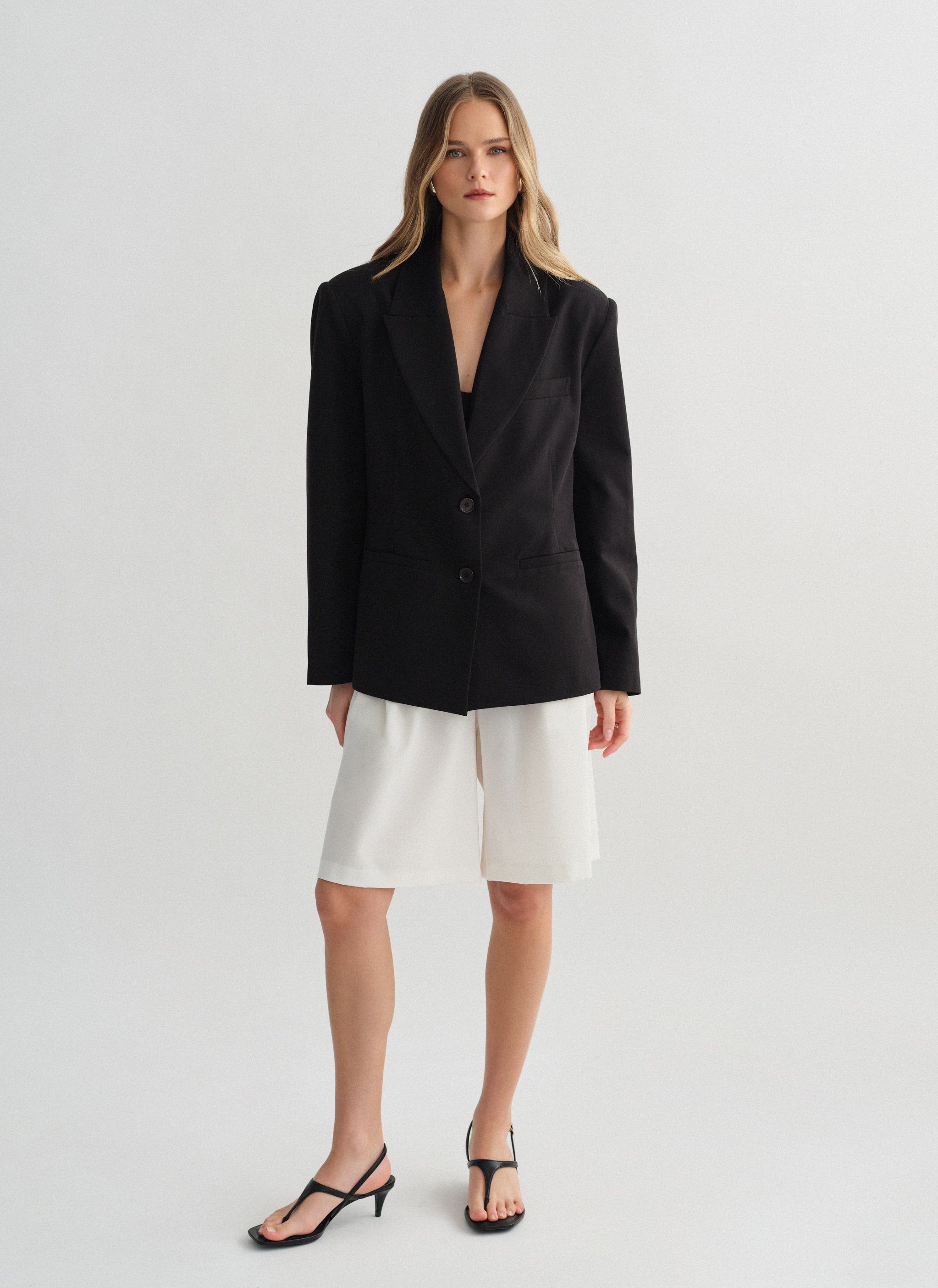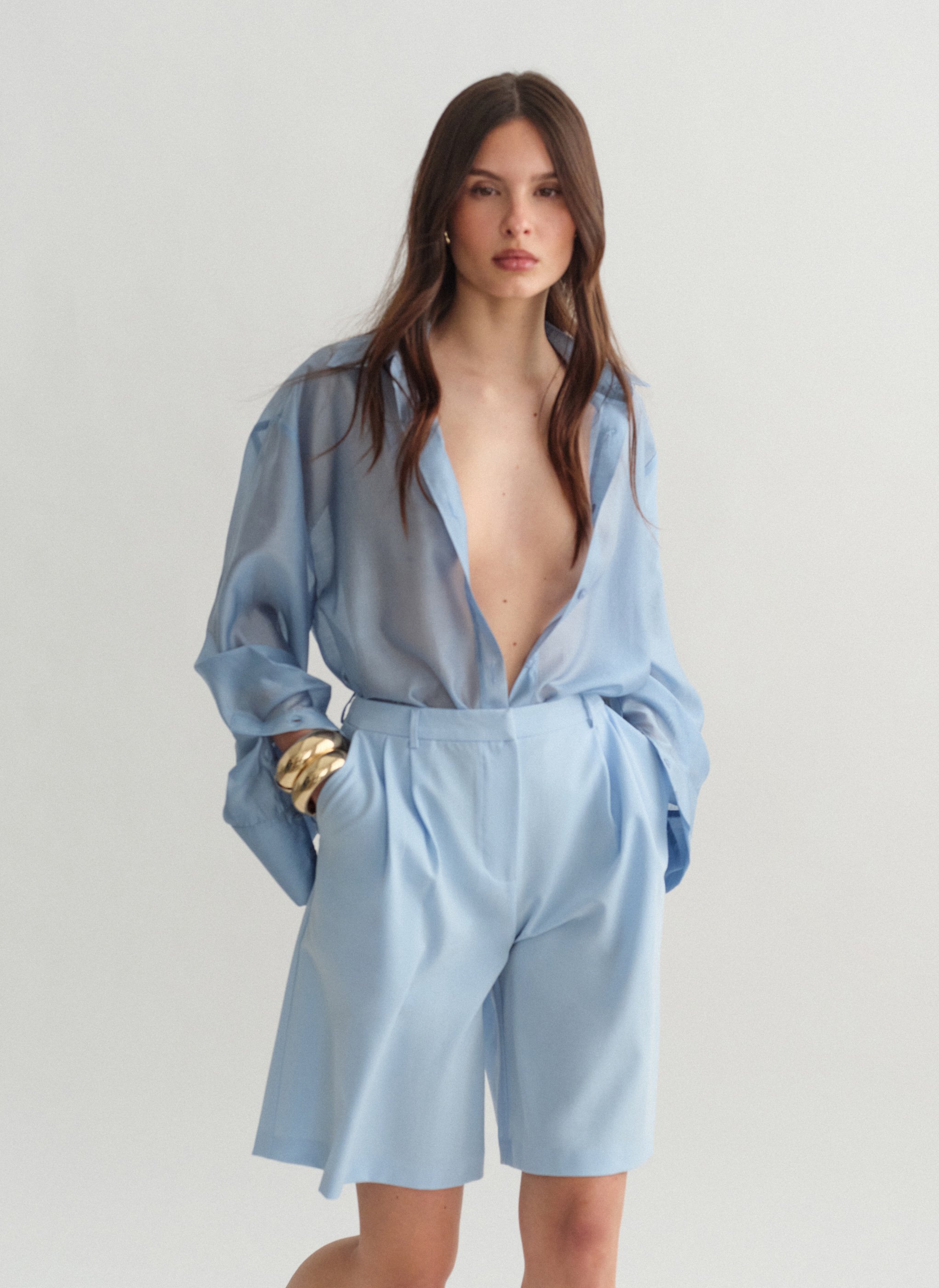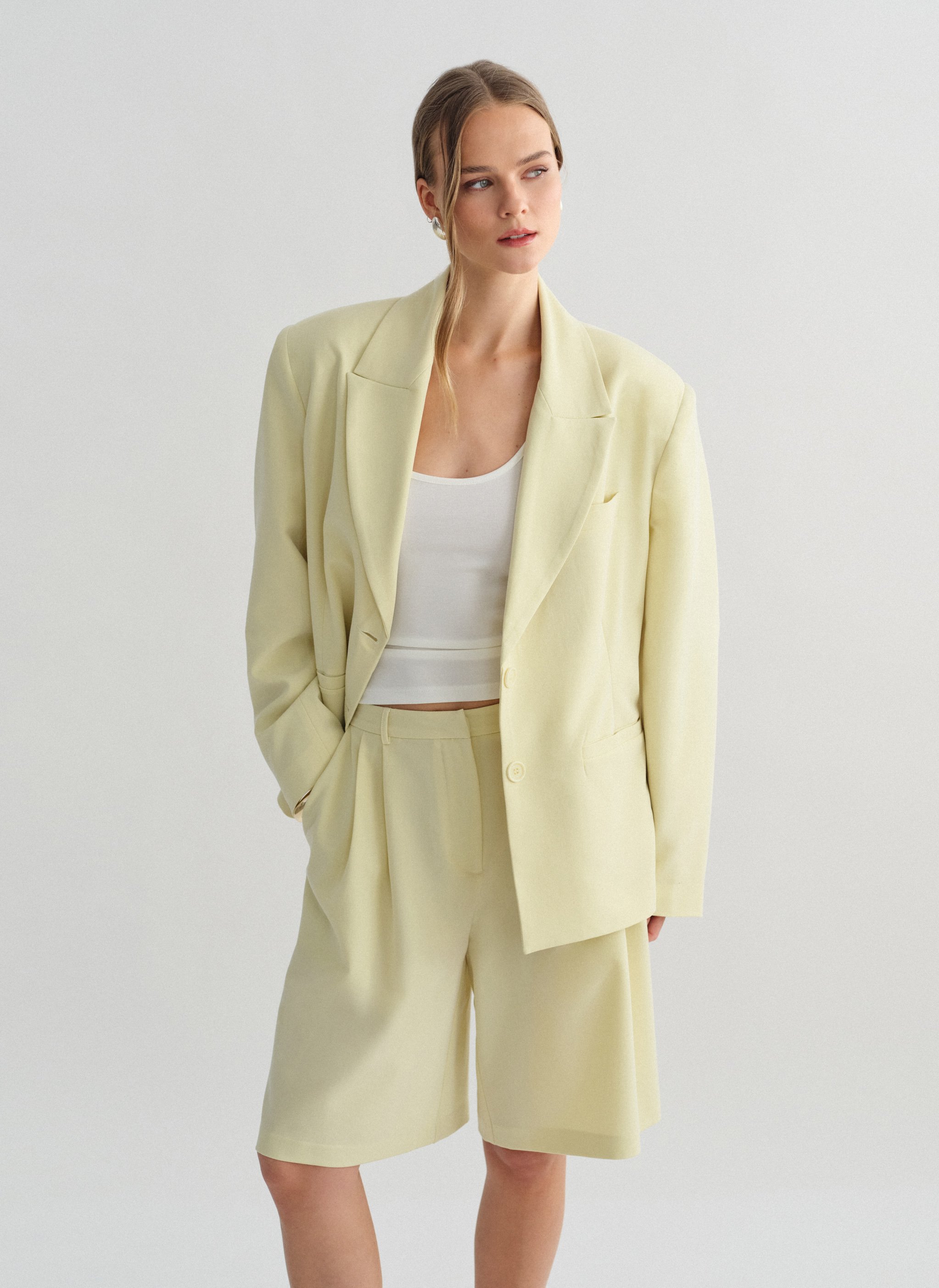 Ψηλόμεση μακριά υφασμάτινη βερμούδα με πιέτες και τσέπες.