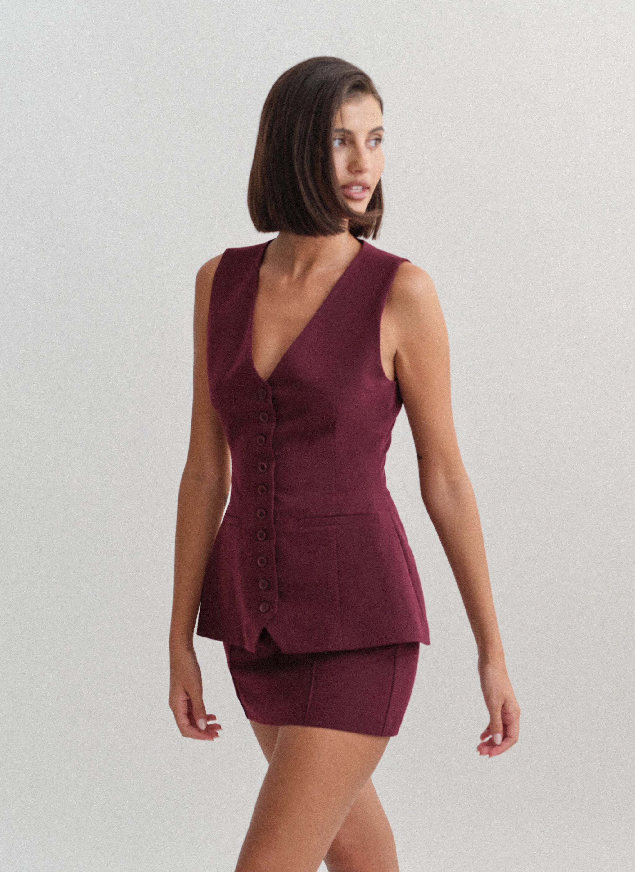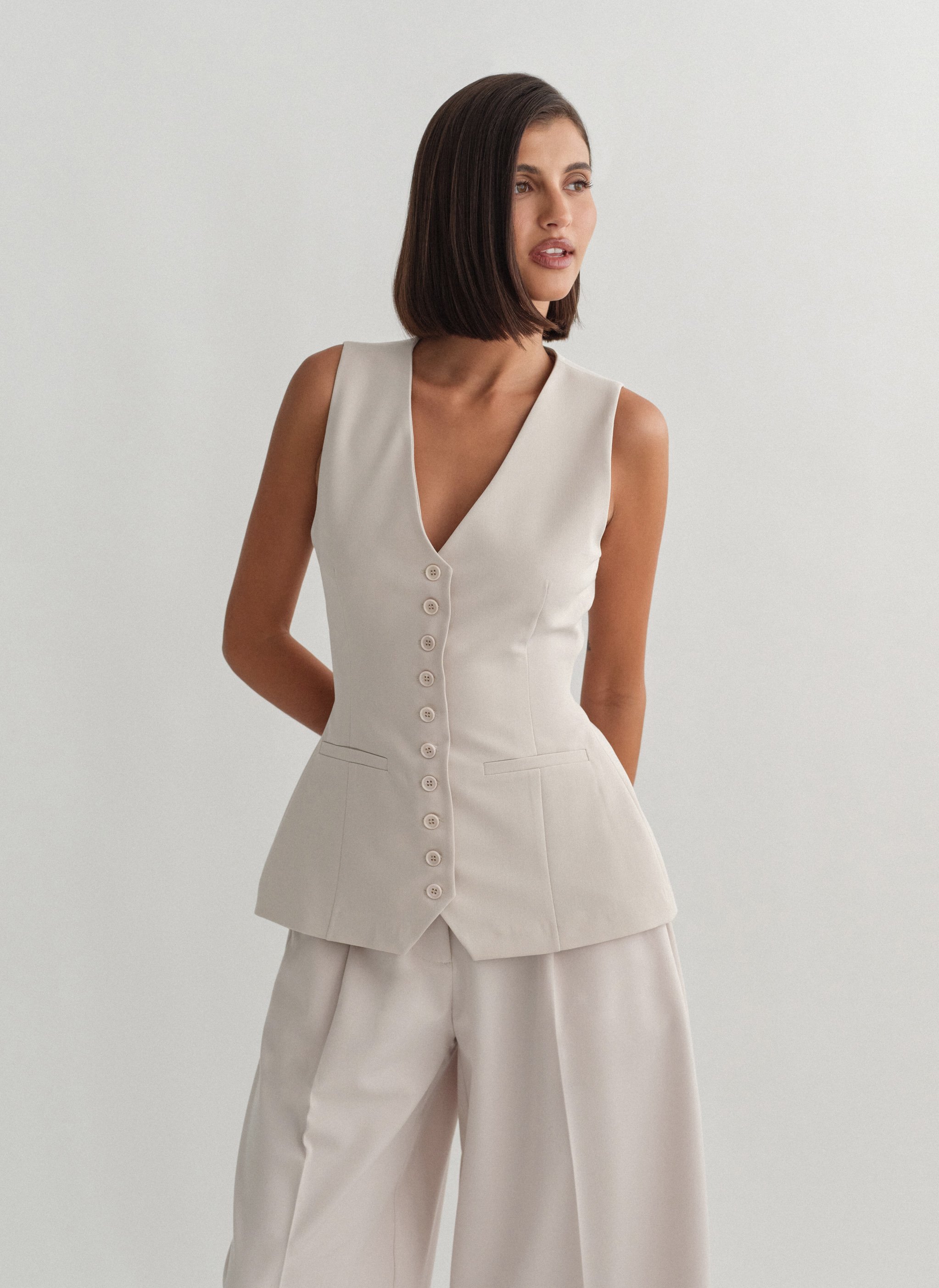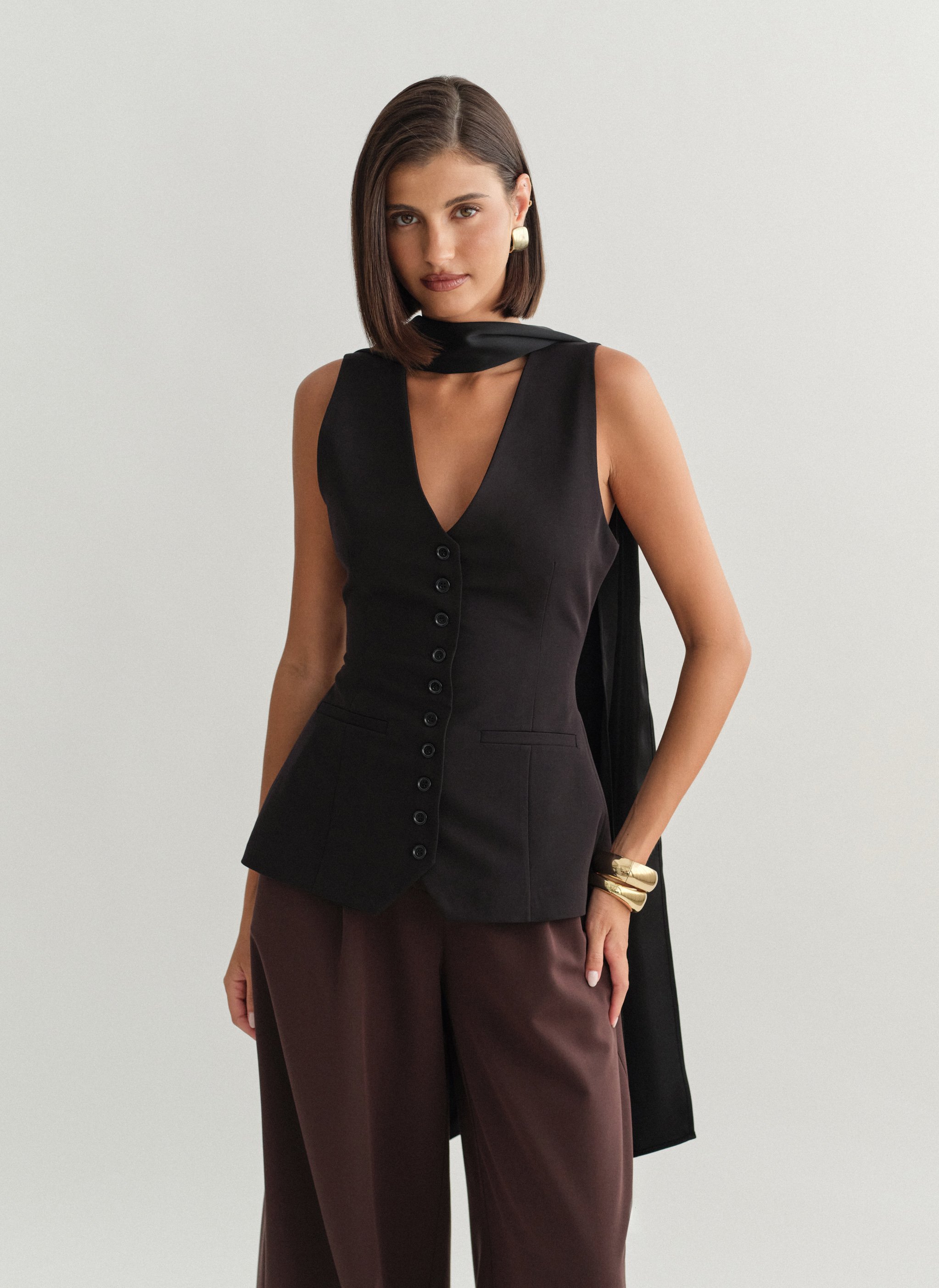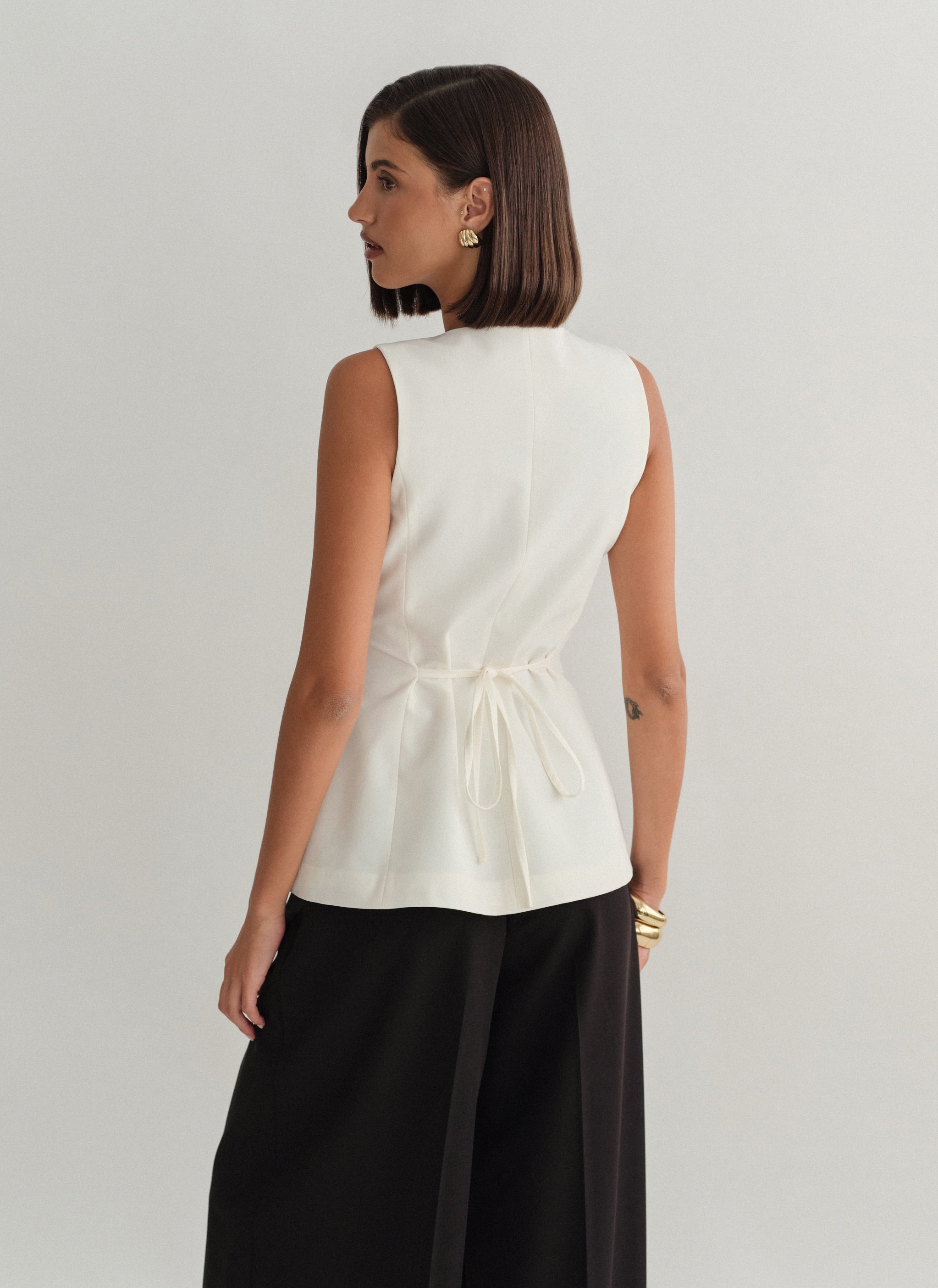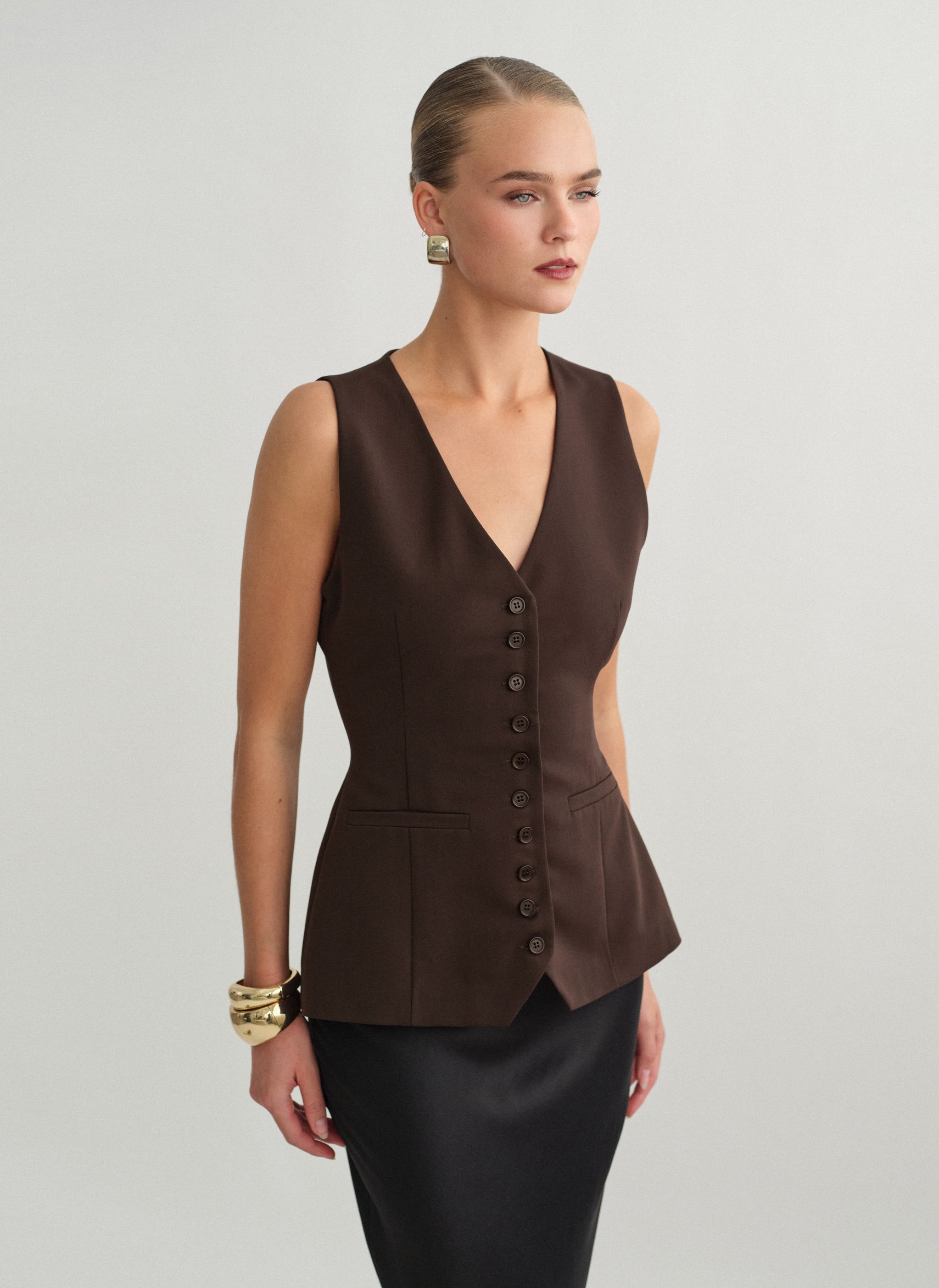 Μεσάτο μακρύ υφασμάτινο γιλέκο με κουμπιά και δέσιμο στην πλάτη.