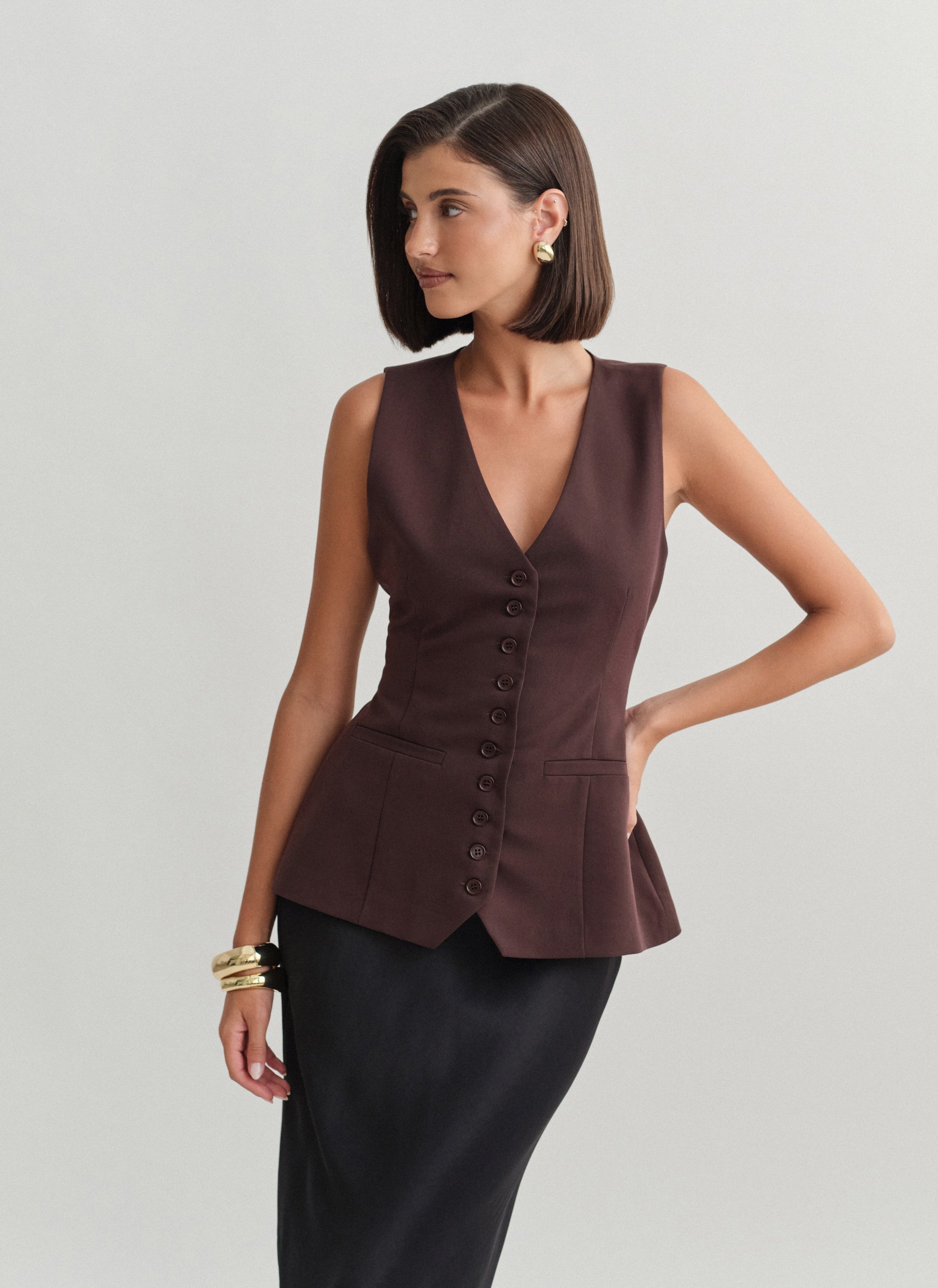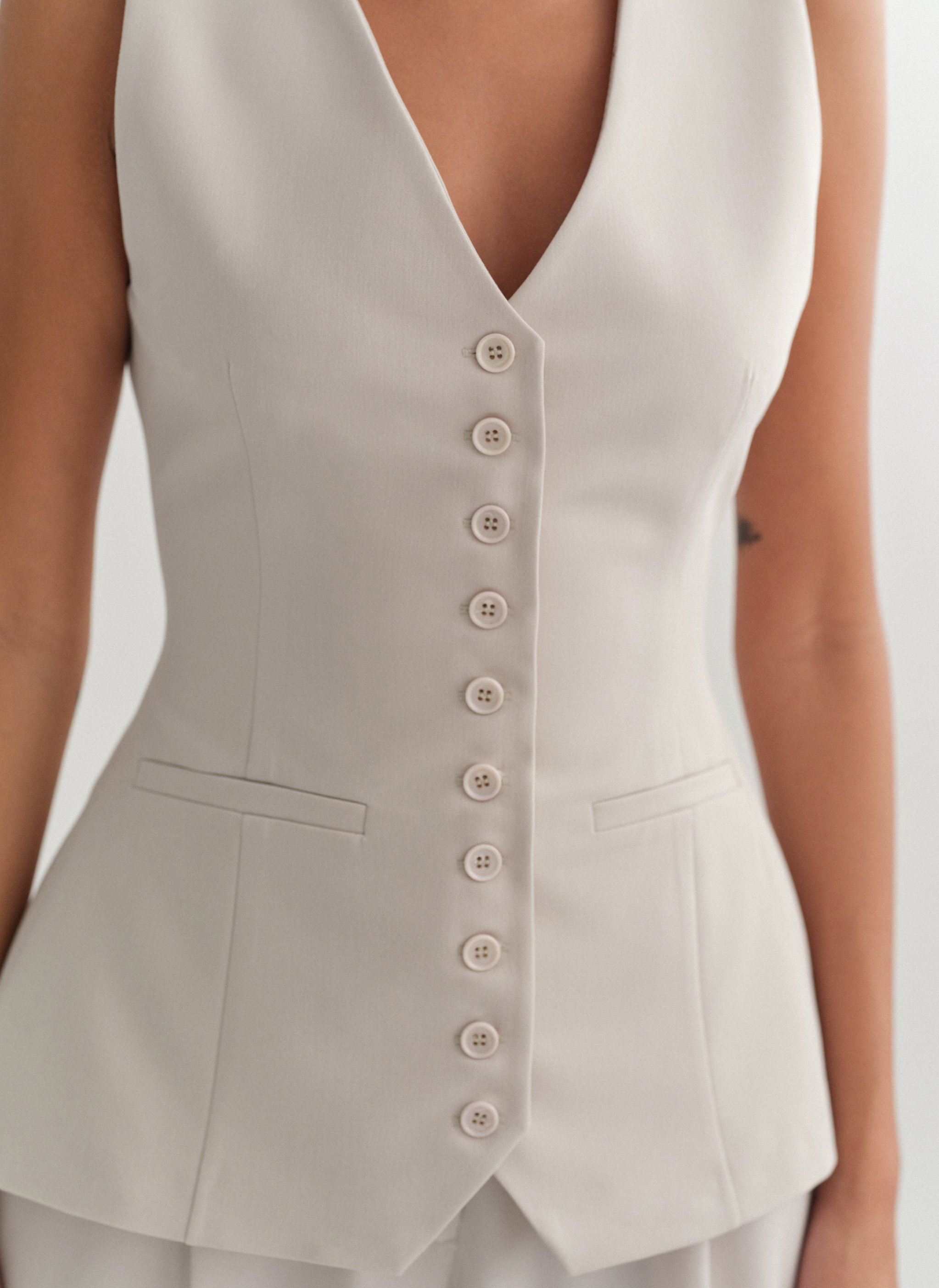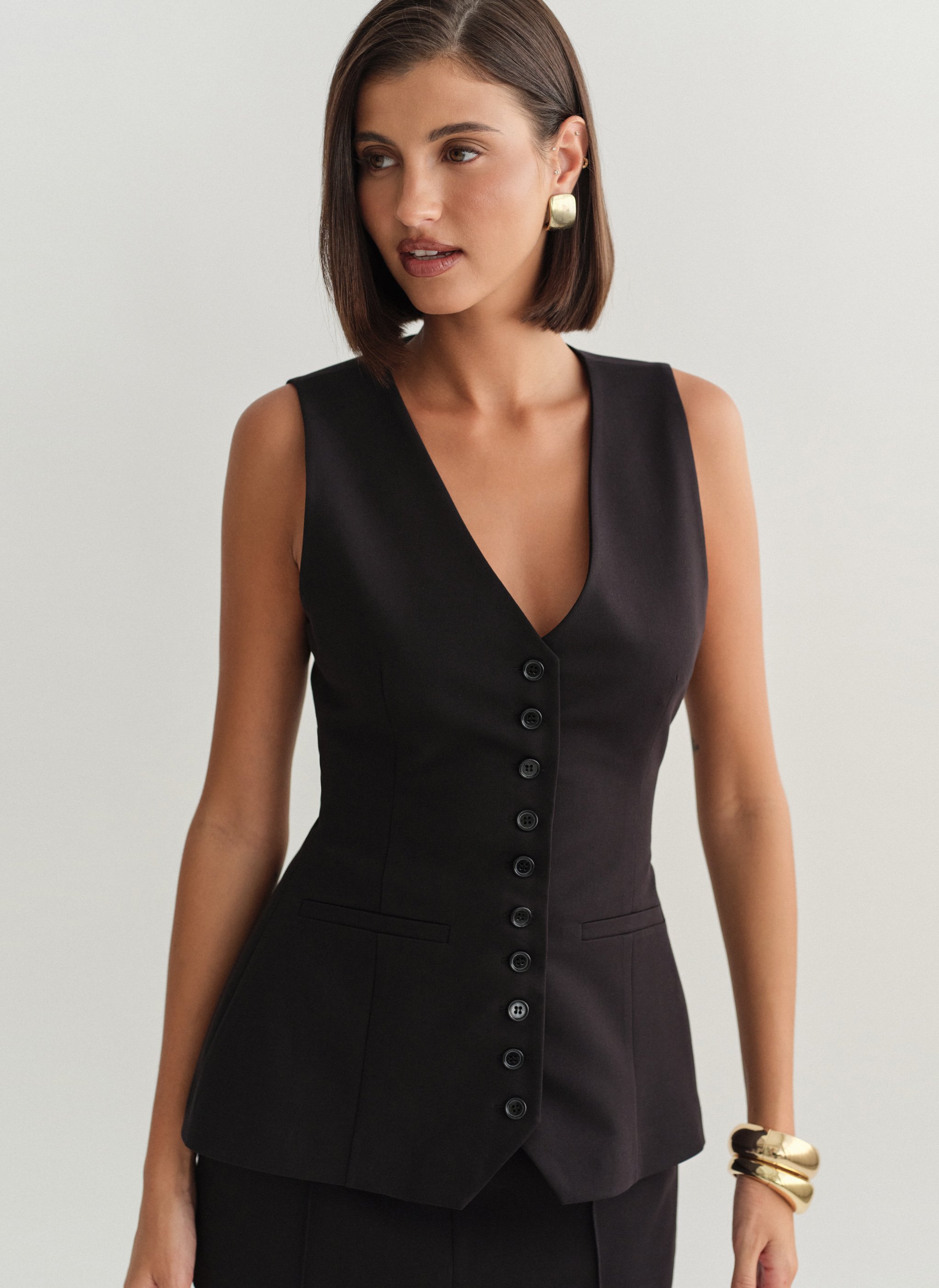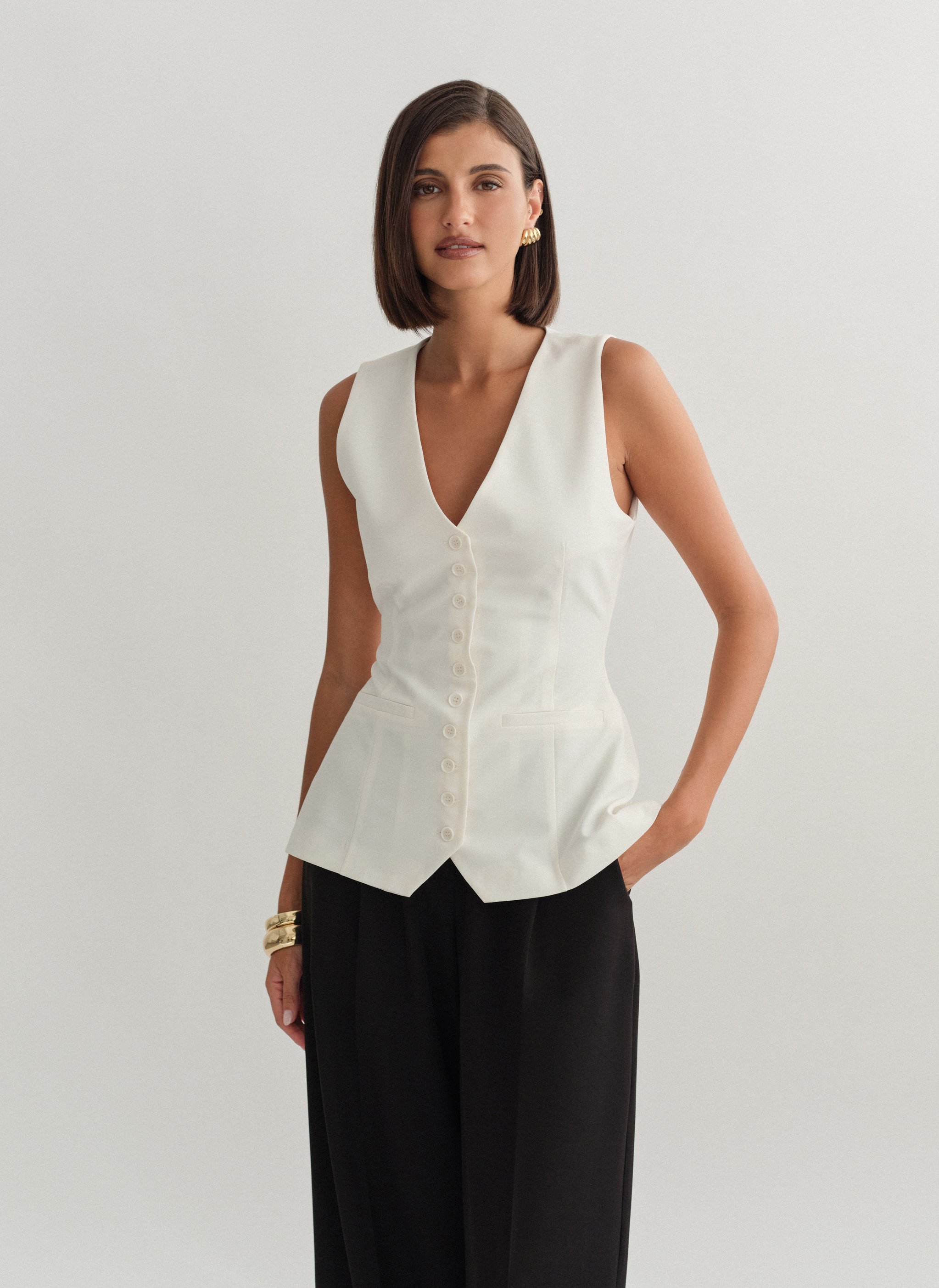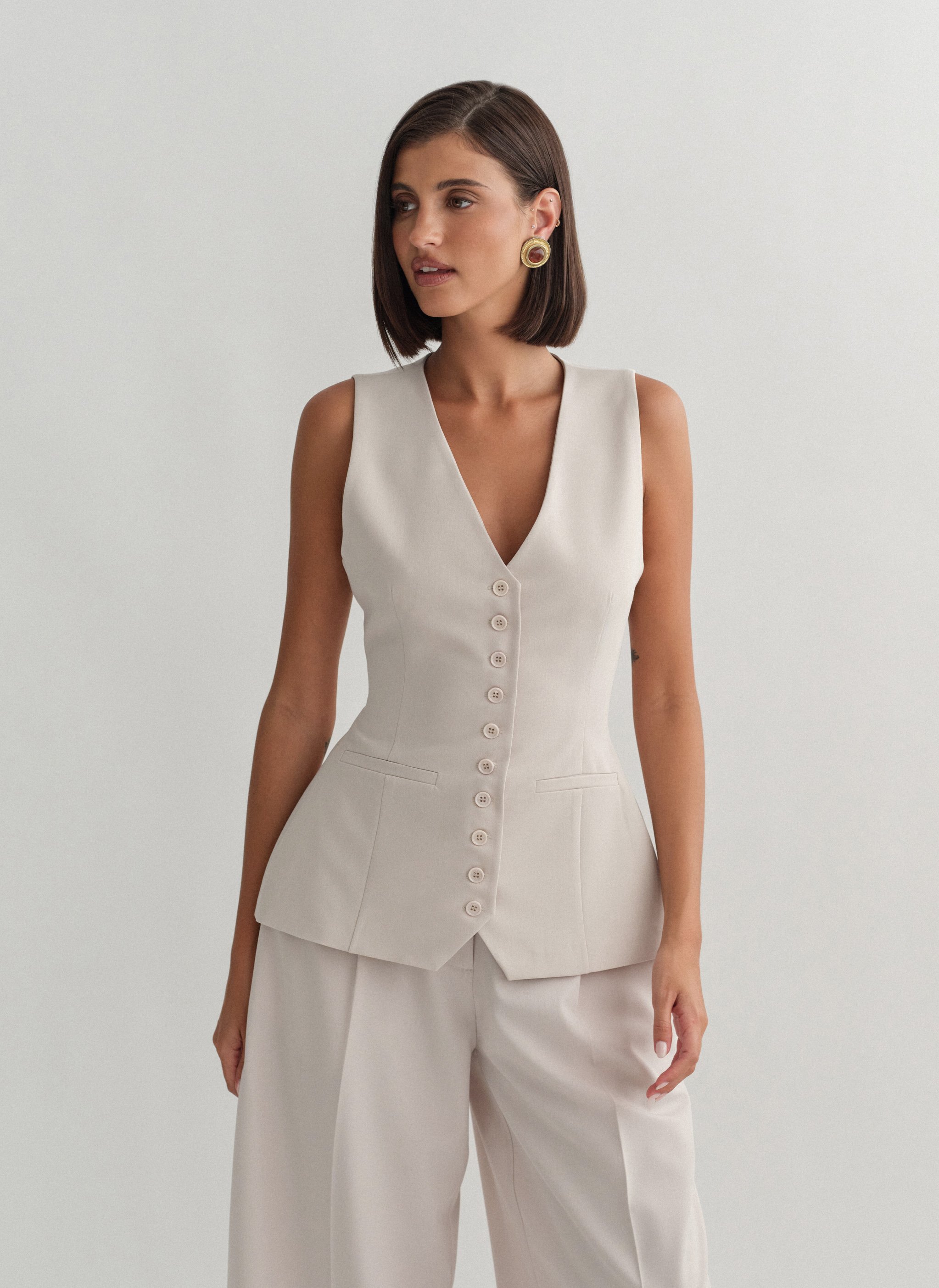Μεσάτο μακρύ υφασμάτινο γιλέκο με κουμπιά και δέσιμο στην πλάτη.