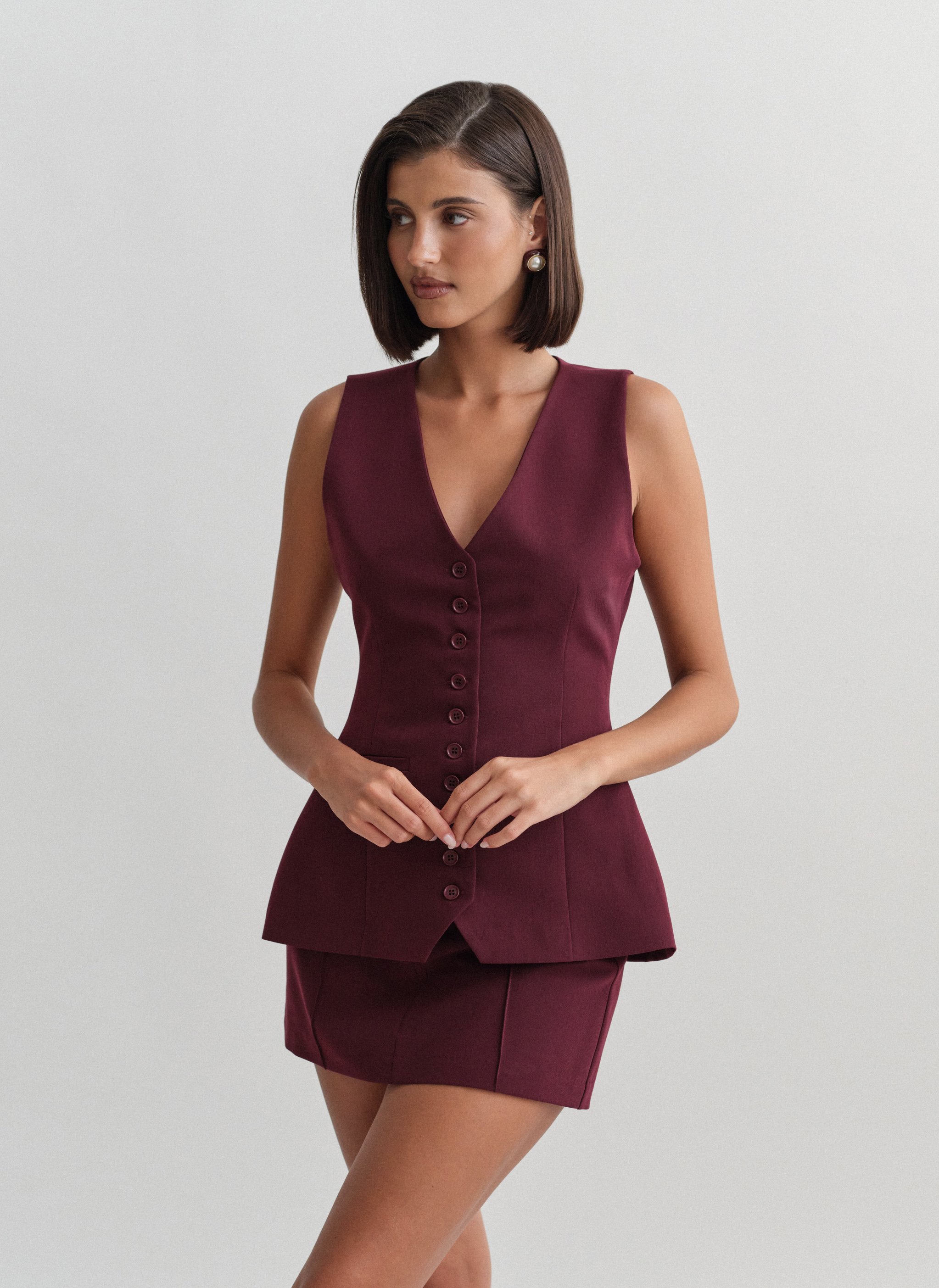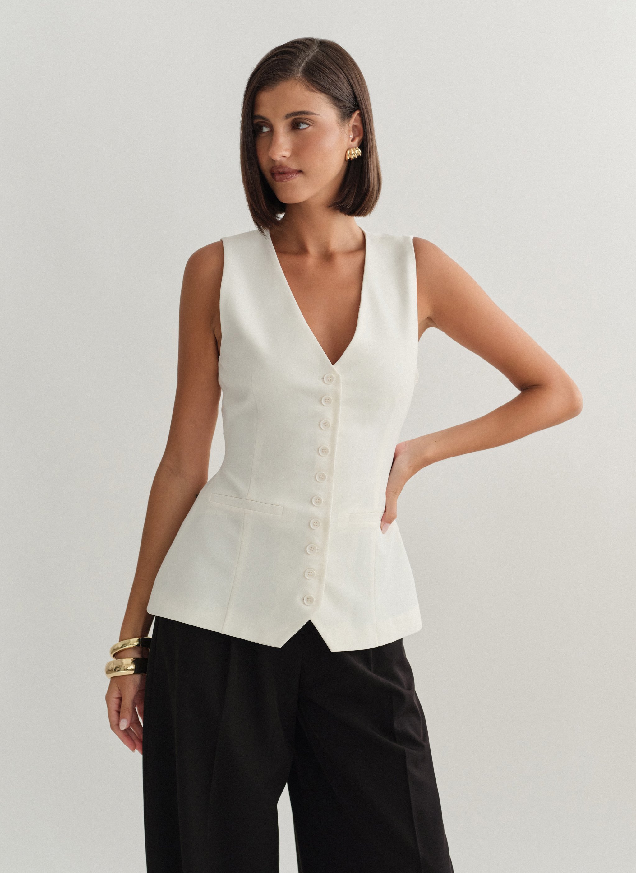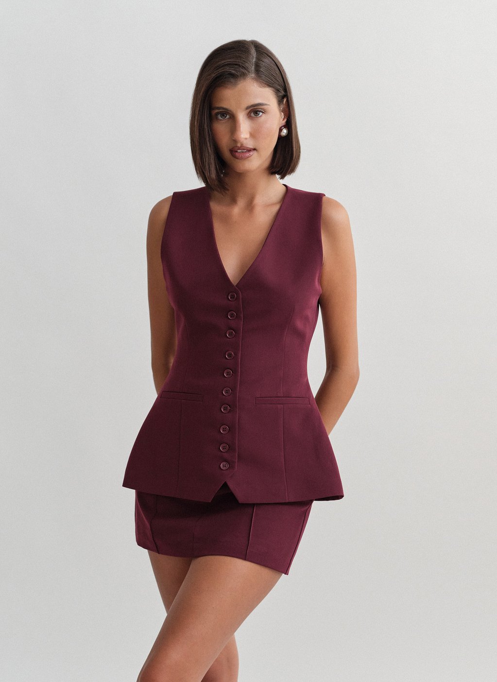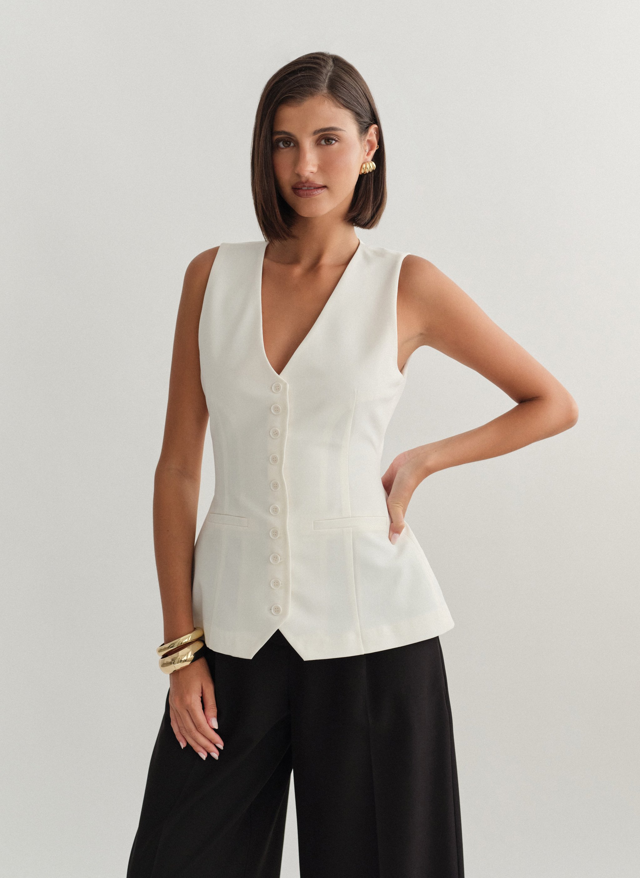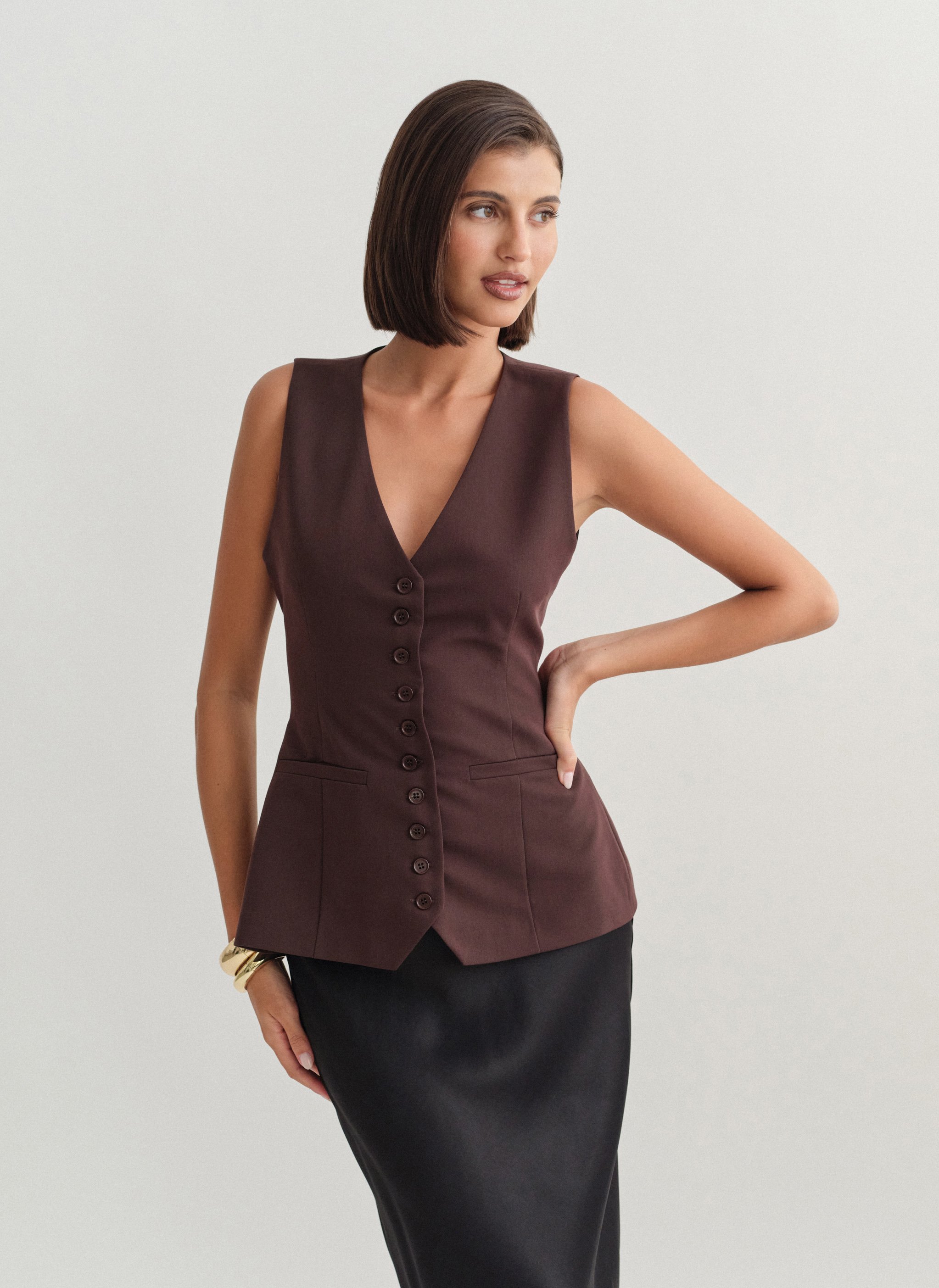 Μεσάτο μακρύ υφασμάτινο γιλέκο με κουμπιά και δέσιμο στην πλάτη.