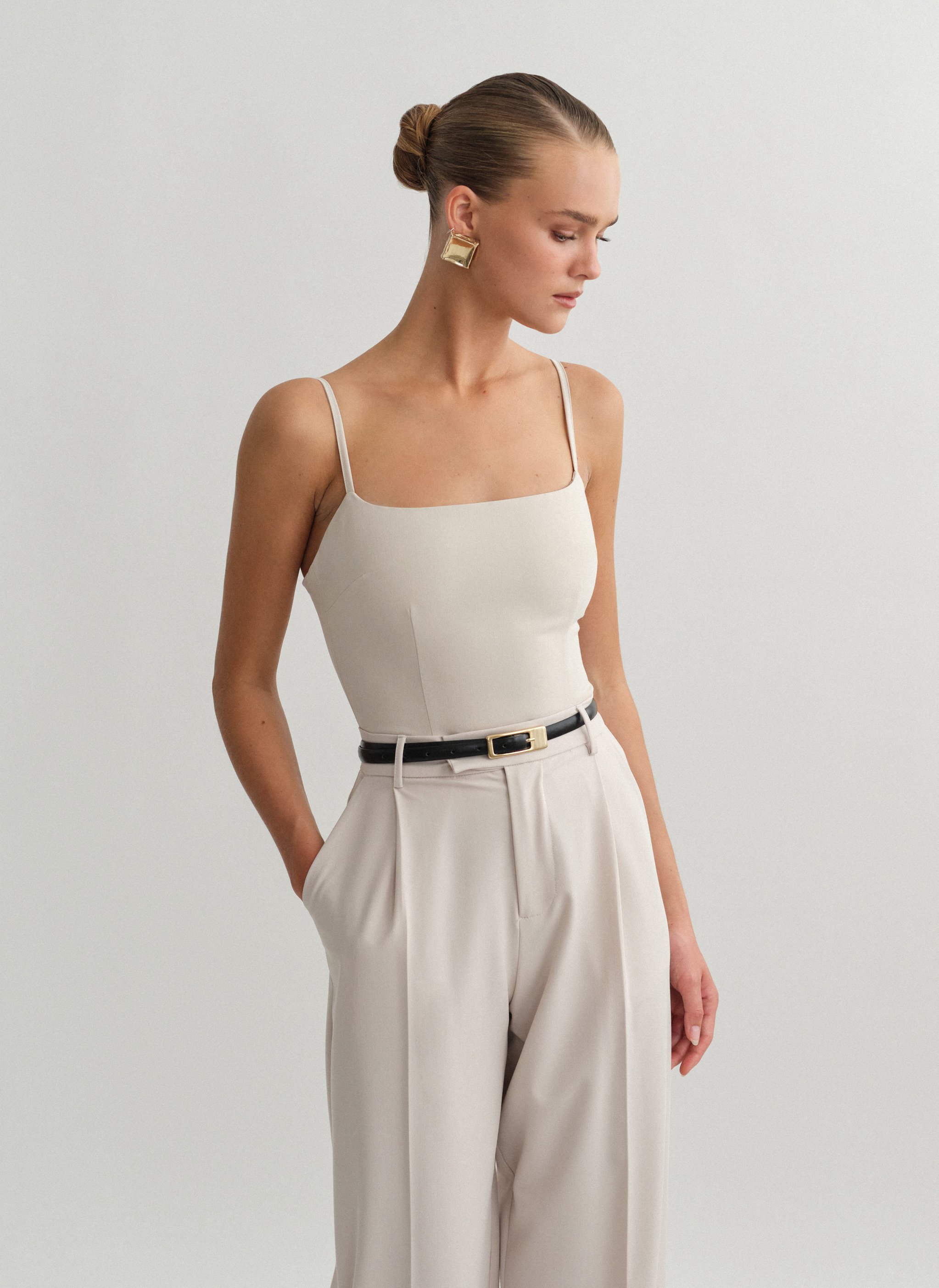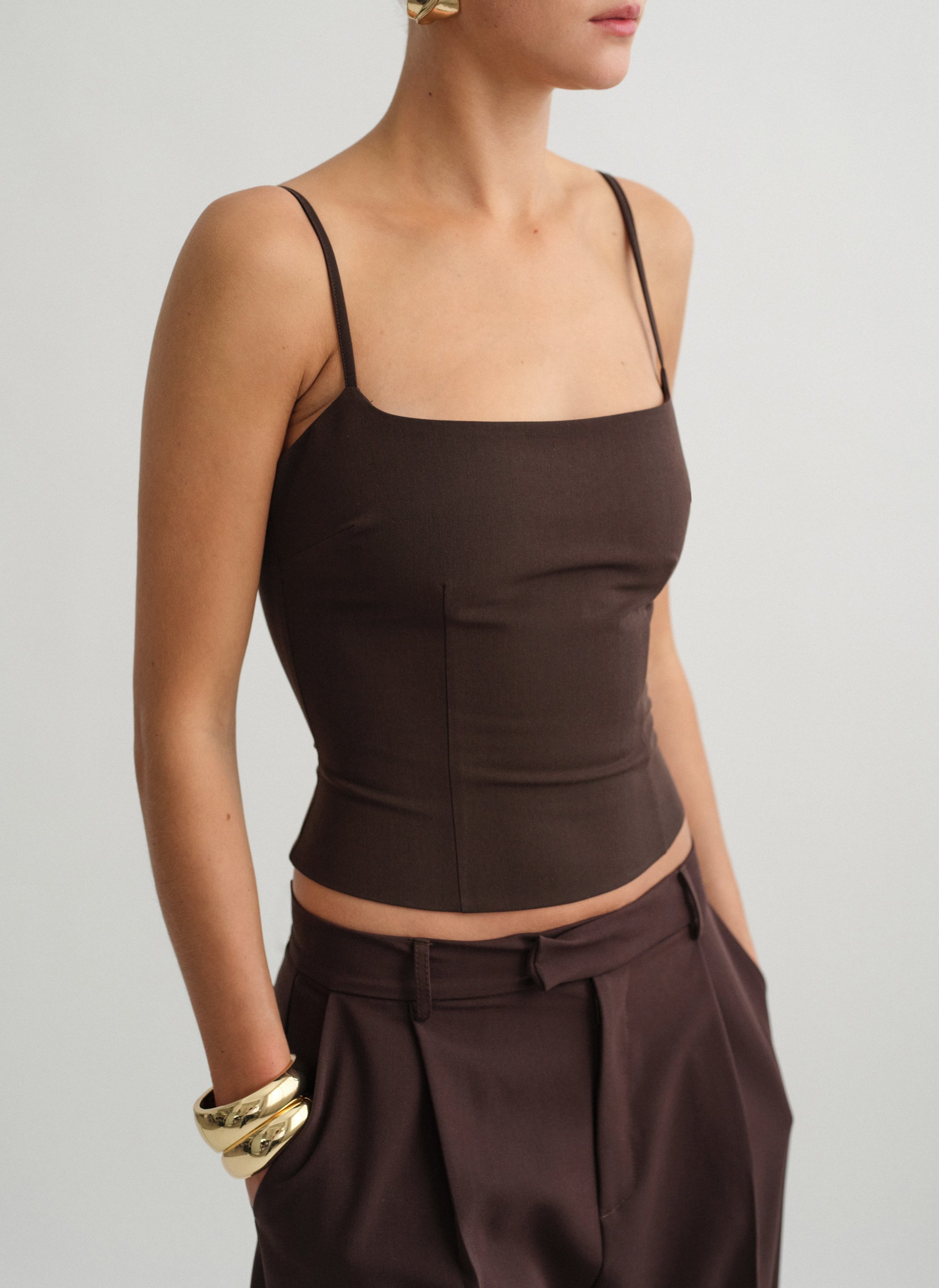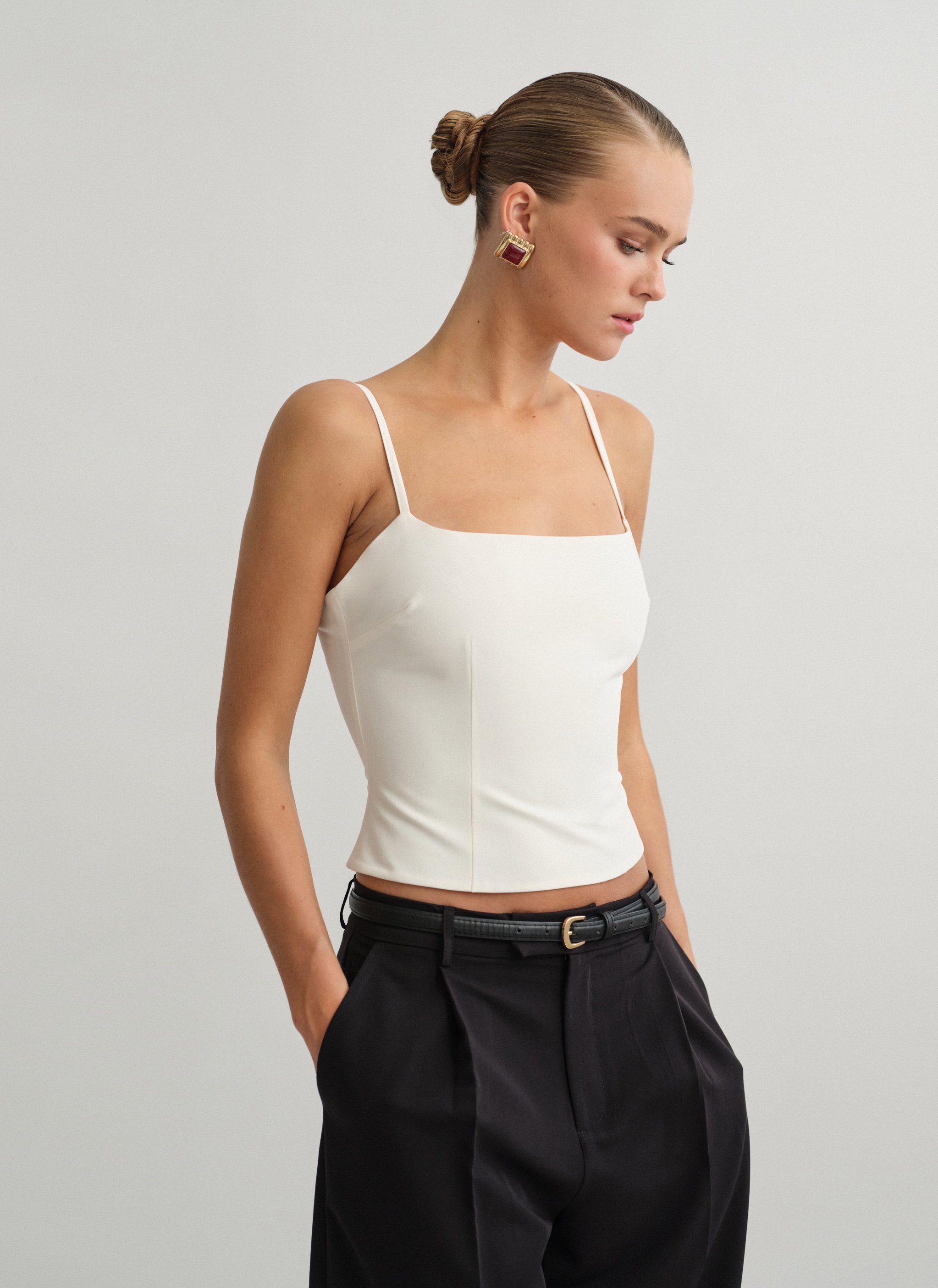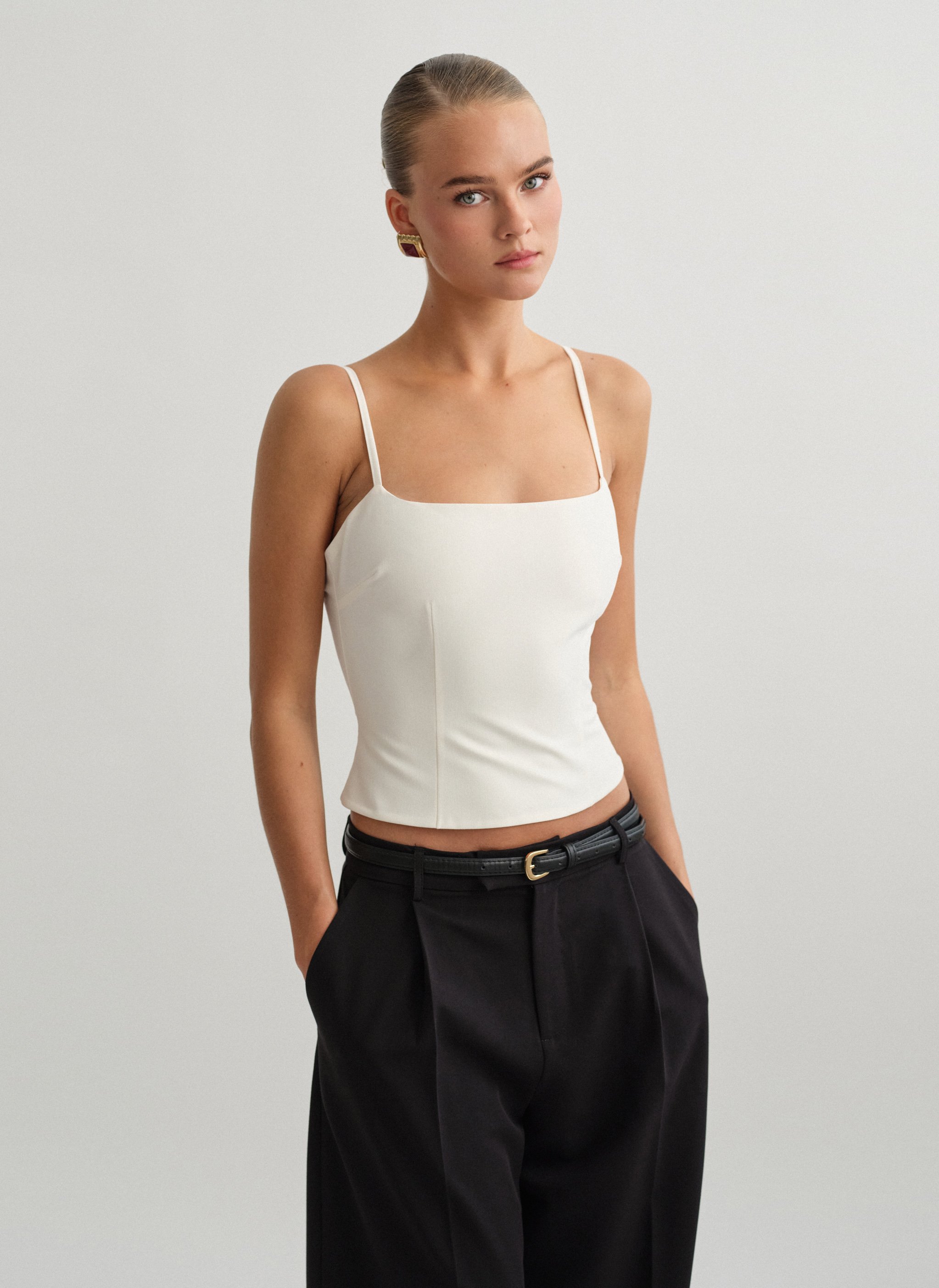 Υφασμάτινο τοπ με λεπτές ρυθμιζόμενες τιράντες και ίσια πλάτη.